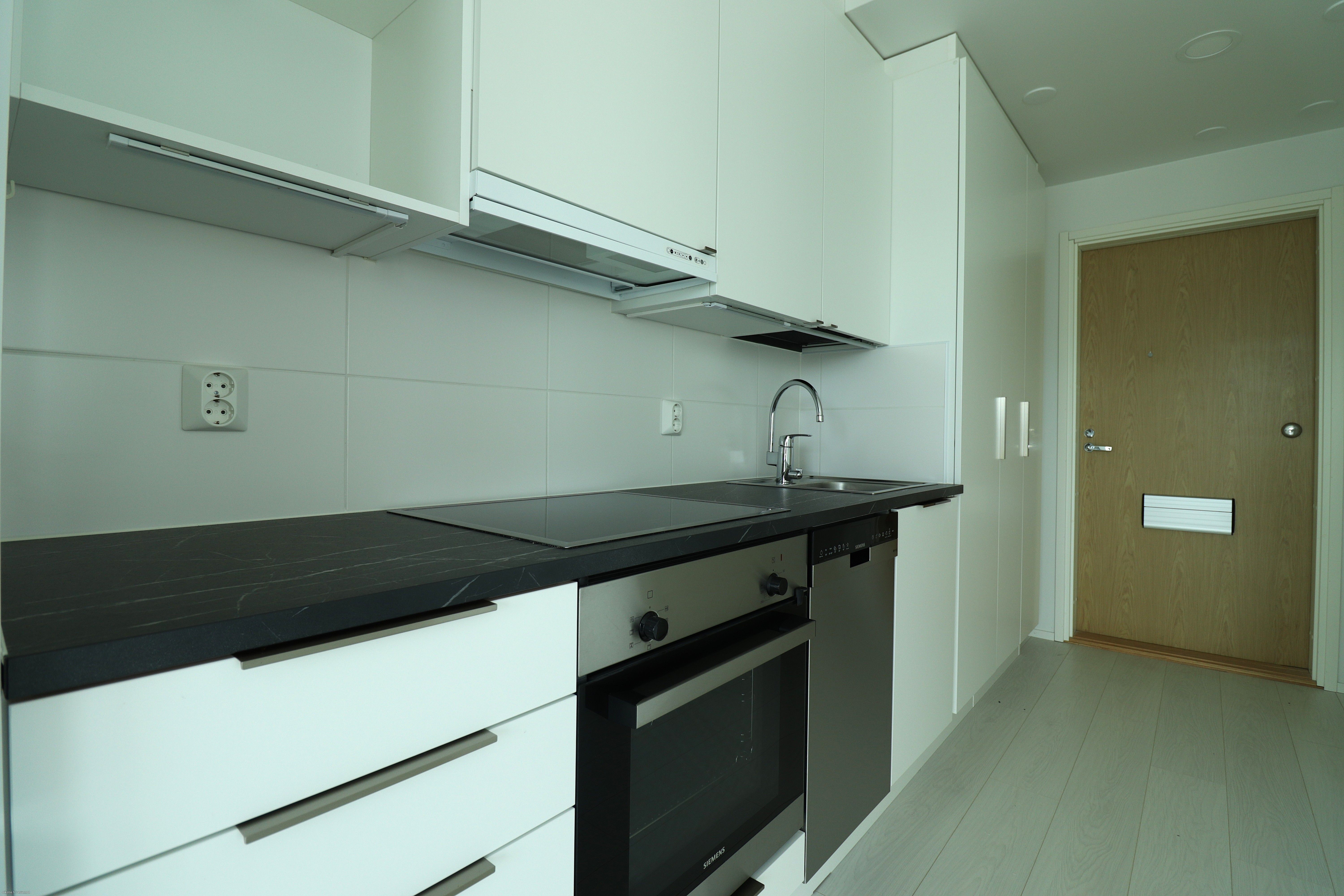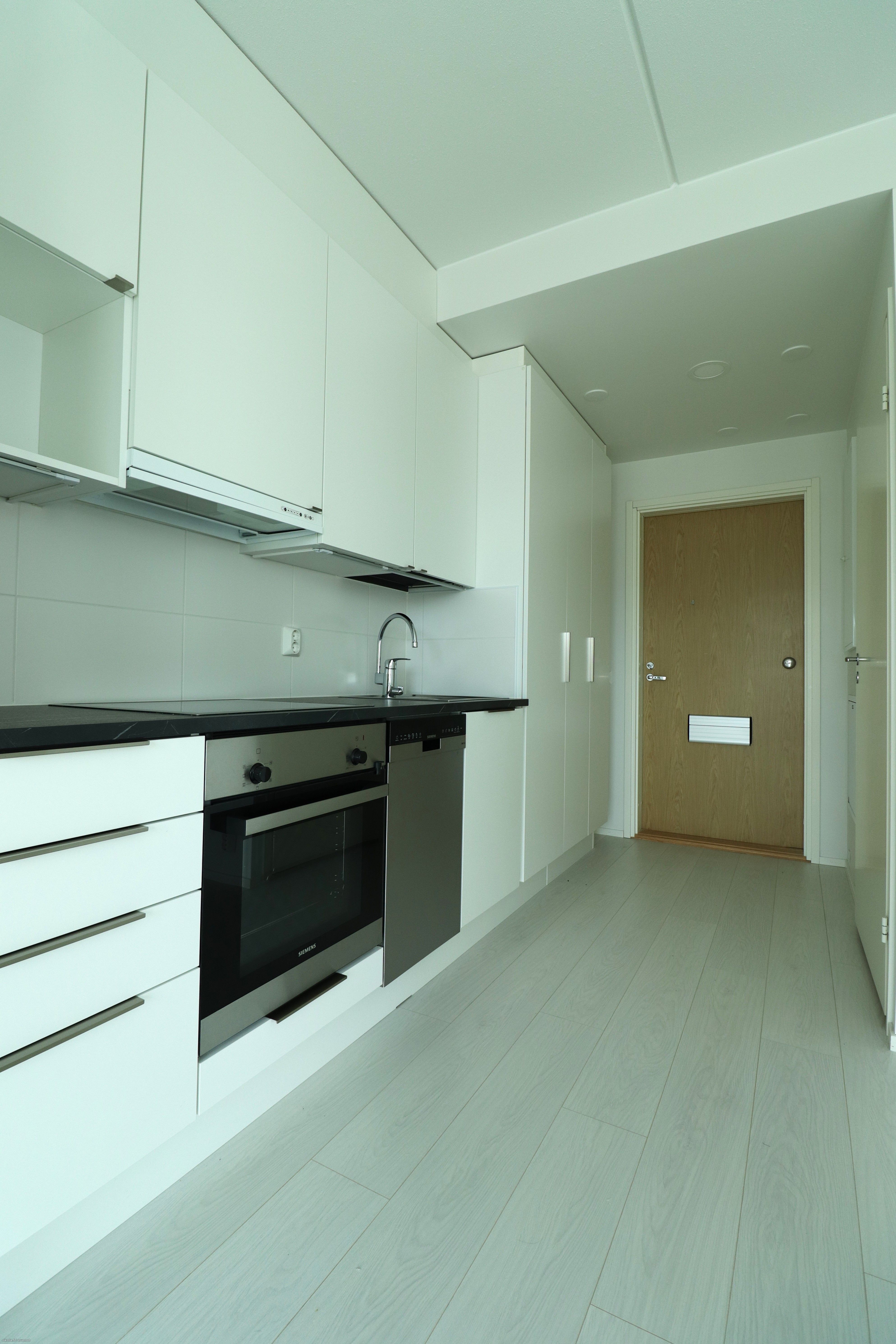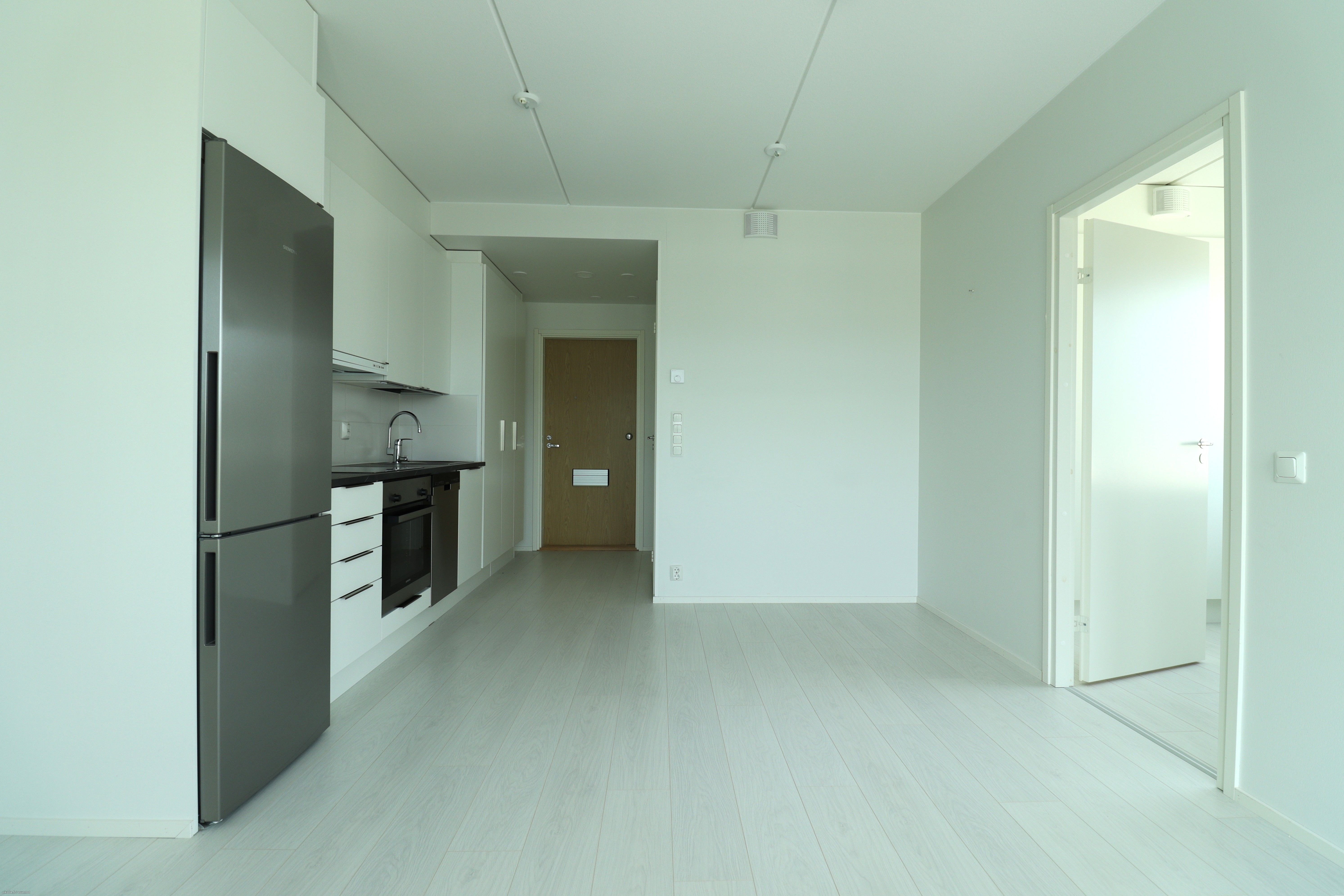 Tämä heti vapaa 7. kerroksen kaksio tarjoaa tyylikkään ja modernin kokonaisuuden. Lattiat ovat vaaleaa laminaattia ja seinäpinnat maalatut. Kylpyhuoneessa ja makuuhuoneessa tehosteseinät tuovat sisustukseen ilmettä. Keittotilan varusteluun kuuluu laadukkaat kodinkoneet, mm. jääkaappipakastin, astianpesukone, erillisuuni sekä keittotaso.
