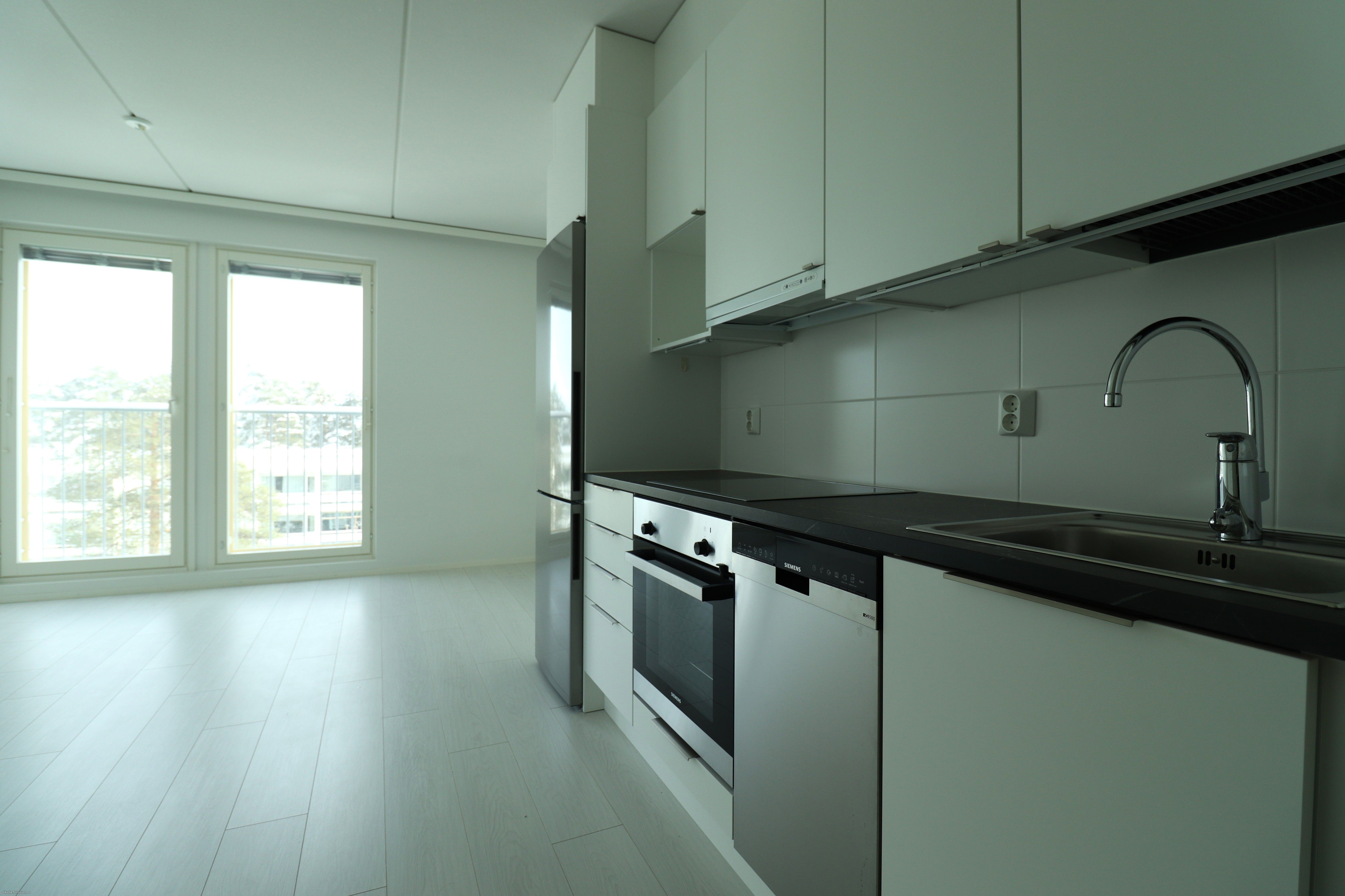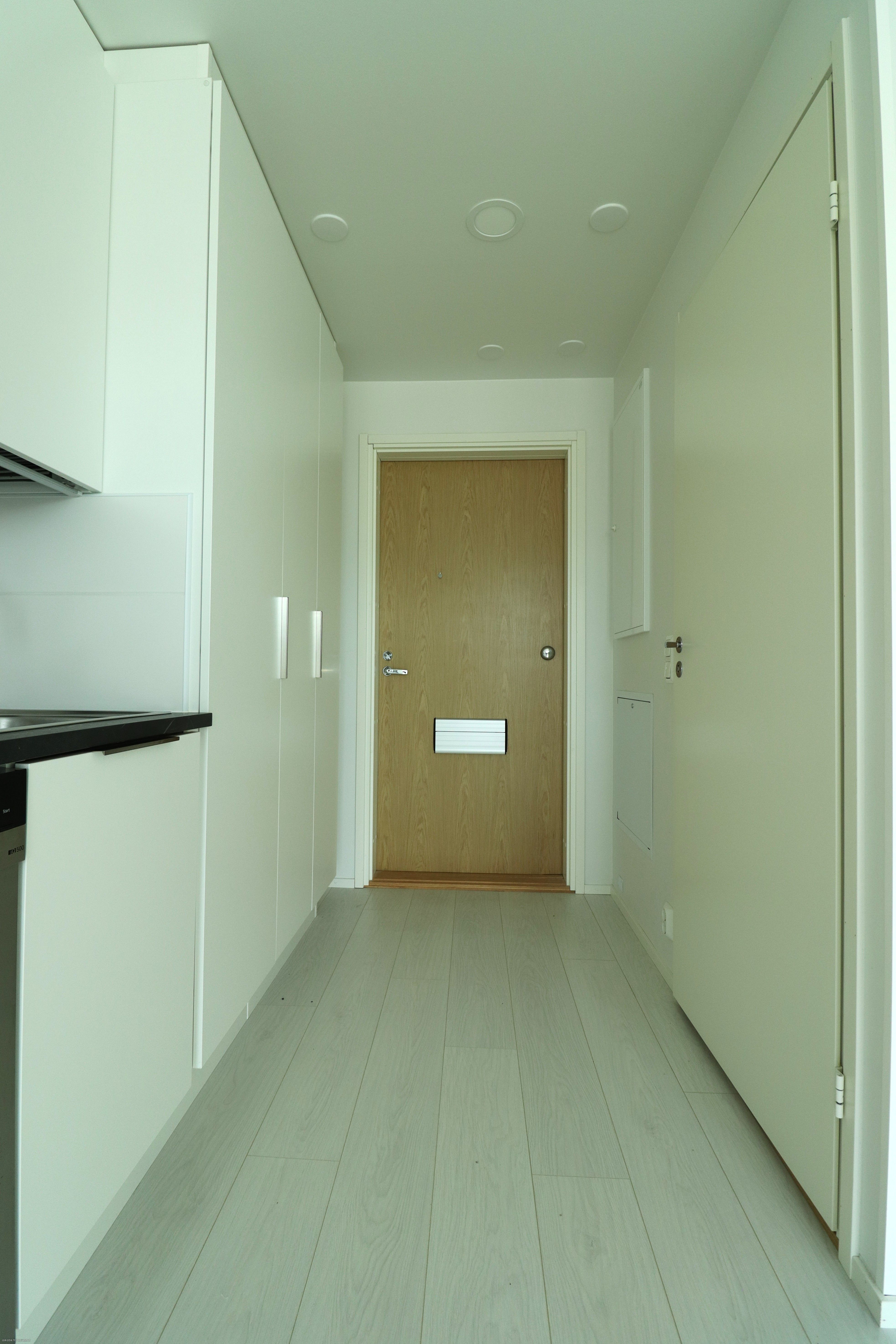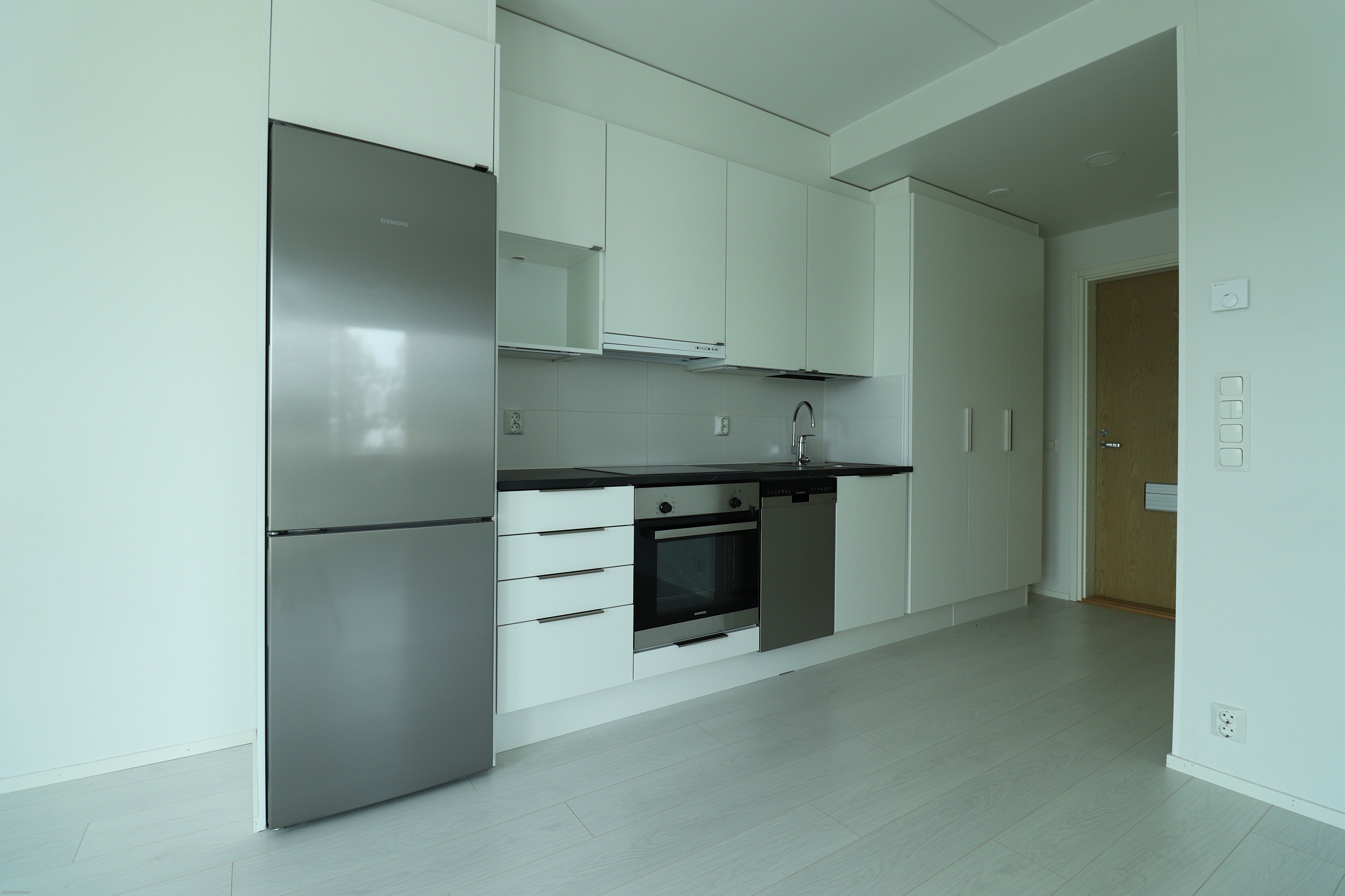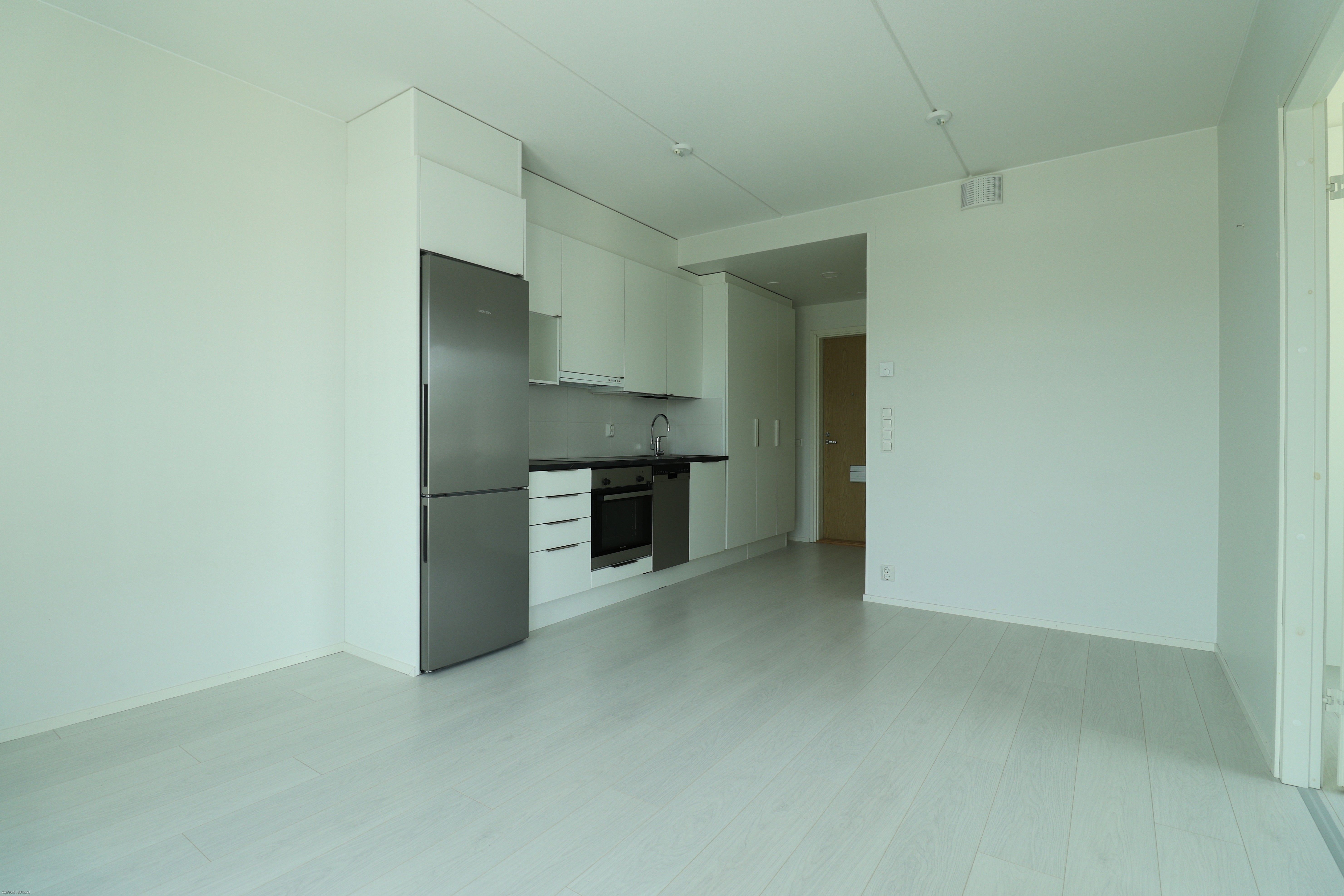 Tämä heti vapaa 7. kerroksen kaksio tarjoaa tyylikkään ja modernin kokonaisuuden. Lattiat ovat vaaleaa laminaattia ja seinäpinnat maalatut. Kylpyhuoneessa ja makuuhuoneessa tehosteseinät tuovat sisustukseen ilmettä. Keittotilan varusteluun kuuluu laadukkaat kodinkoneet, mm. jääkaappipakastin, astianpesukone, erillisuuni sekä keittotaso.
