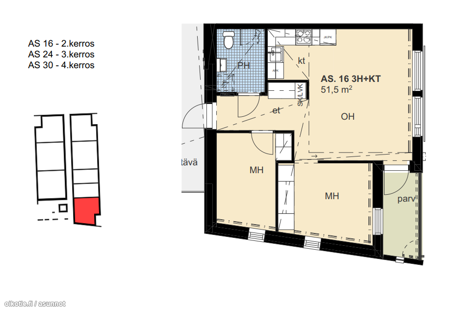 | Huoneiston kokoonpano | 3h+kt+parveke |