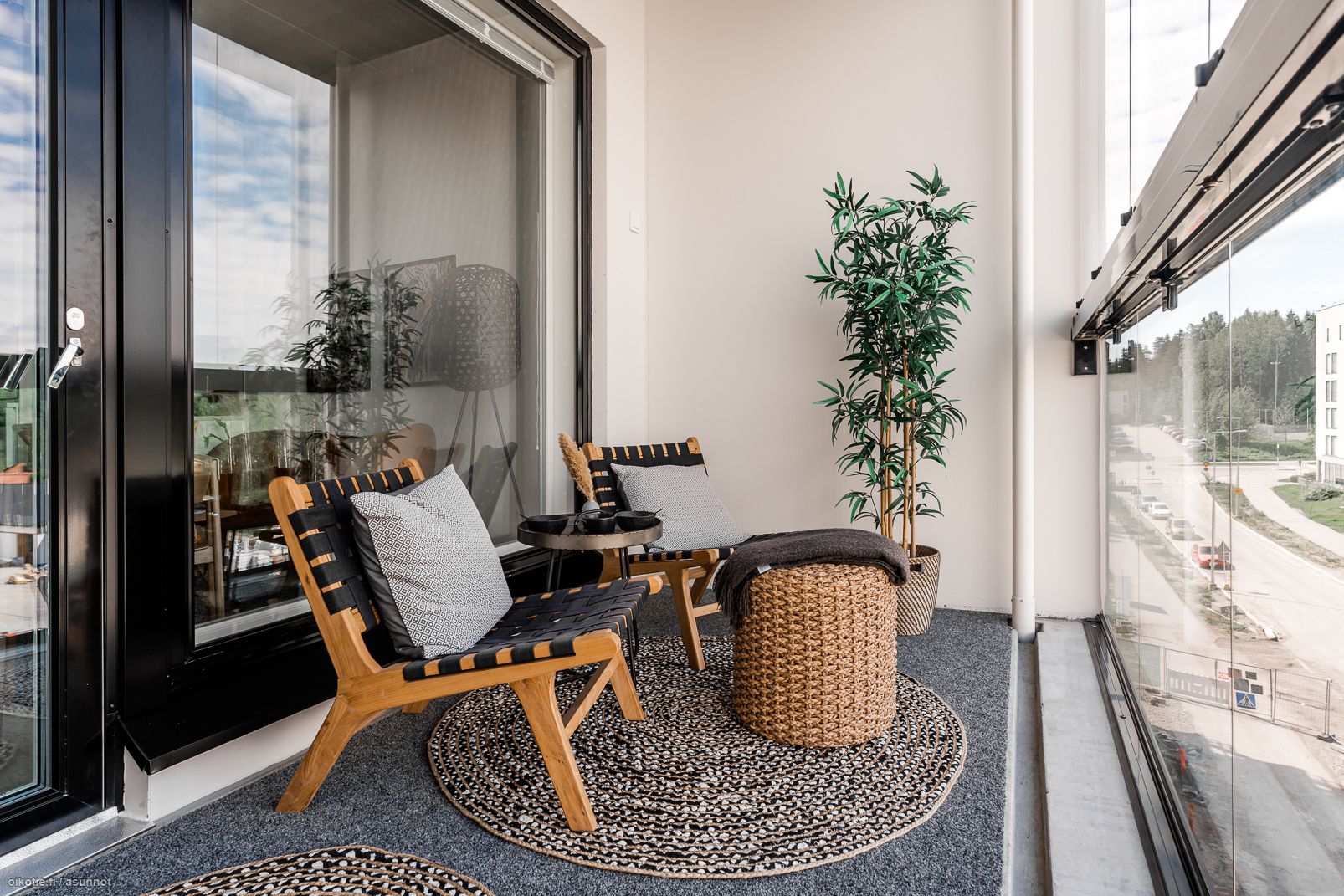 Kompakti lasitetulla parvekkeella varustettu koti Vantaan Rekolanmäestä.
