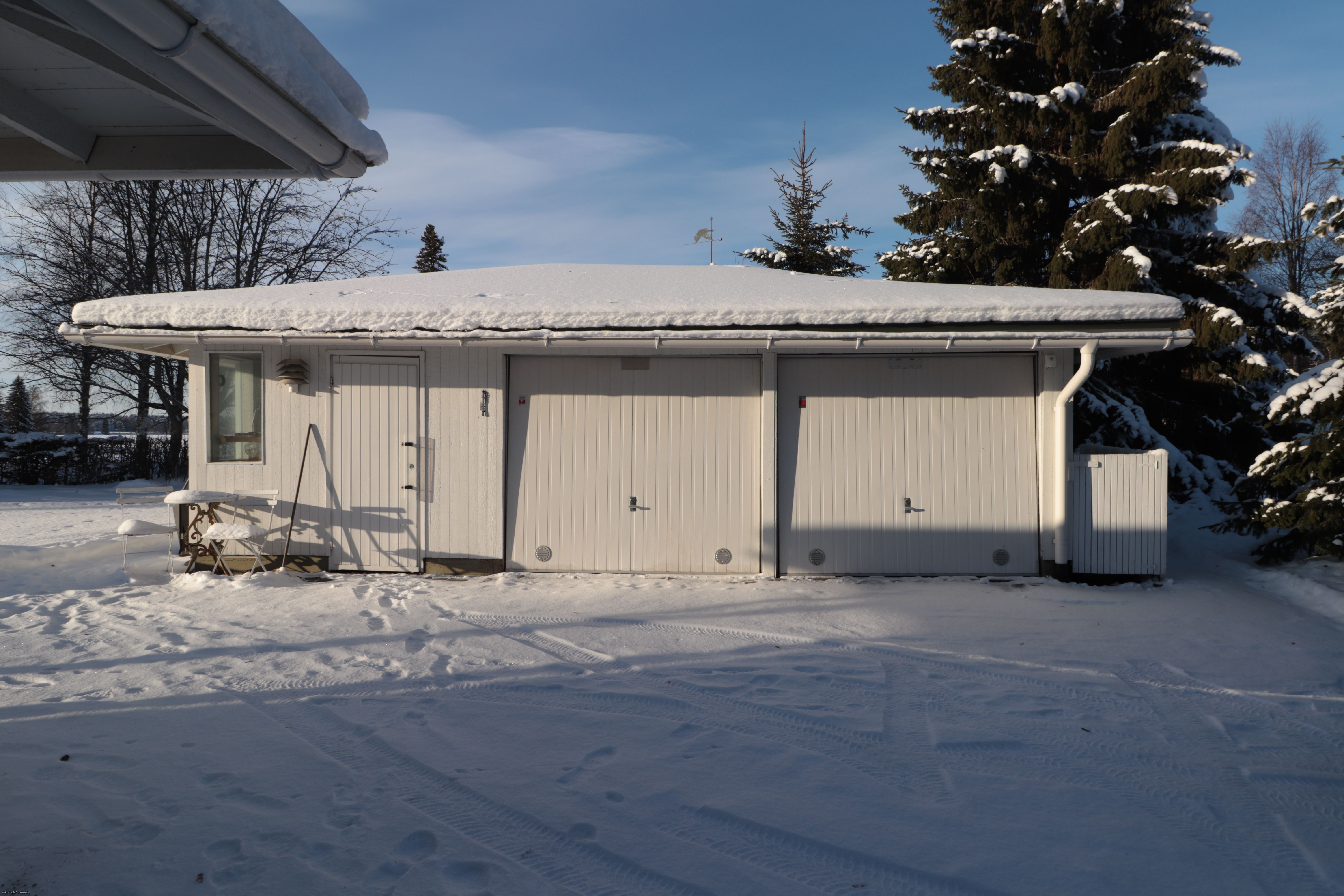 Autotalleja on kaksi ja sähköautolle on latausasema valmiina. Piharakennuksessa ulkovarasto.