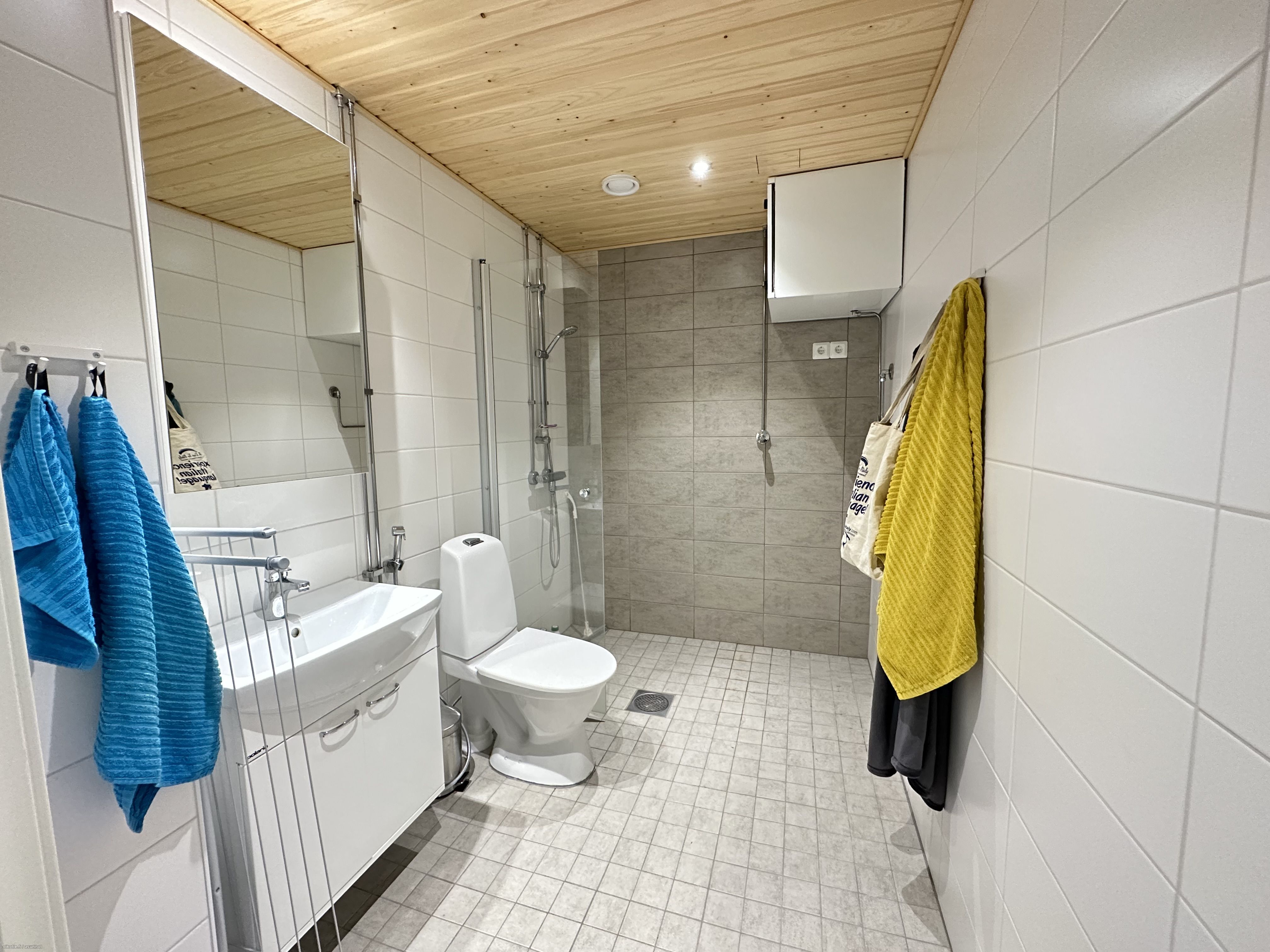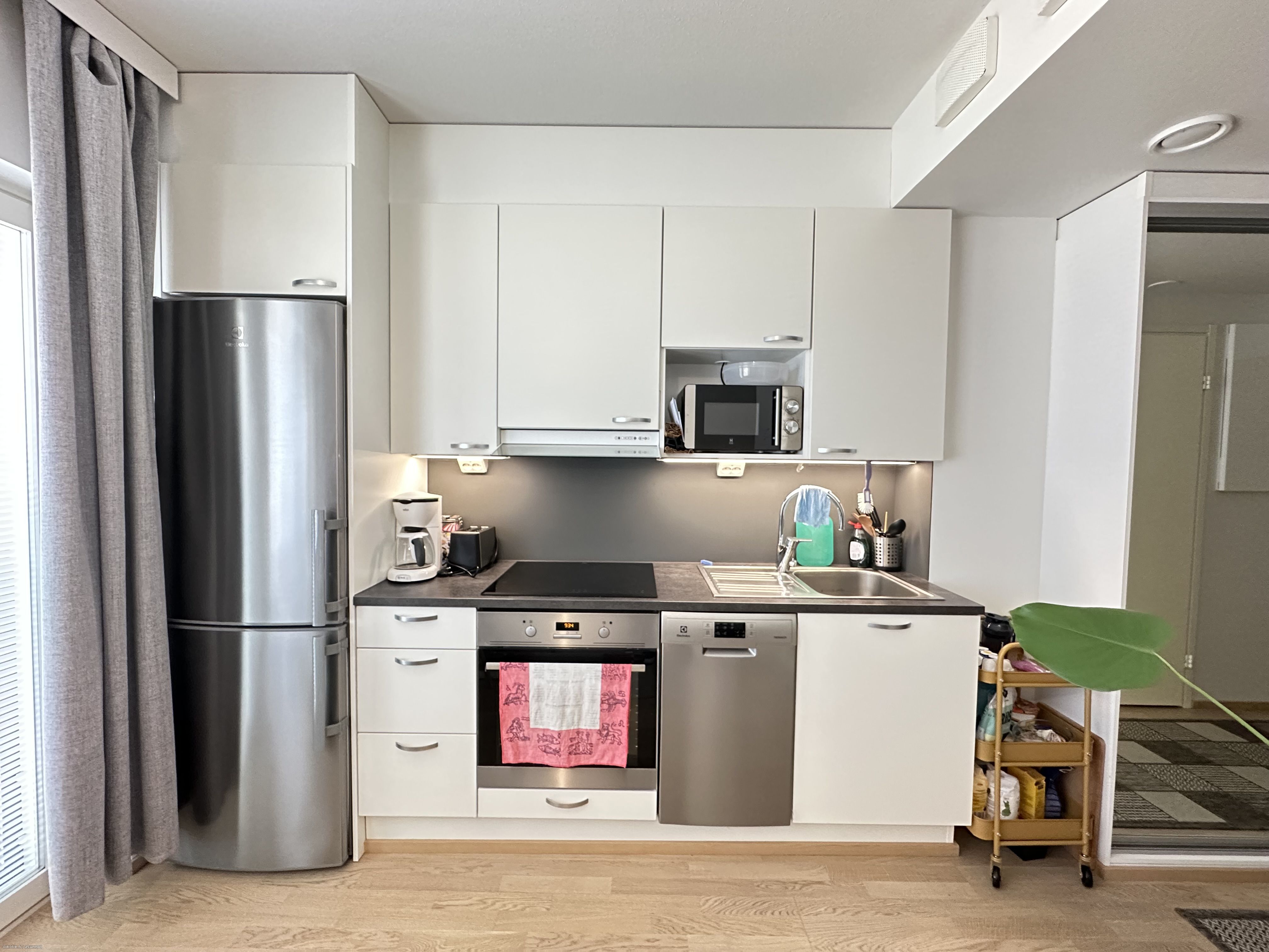 Keittiössä valmiina liesi, liesituuletin astianpesukone sekä jääkaappipakastin. Kaakeloidussa kylpyhuoneessa paikka ja liitännät omalle pyykinpesukoneelle.