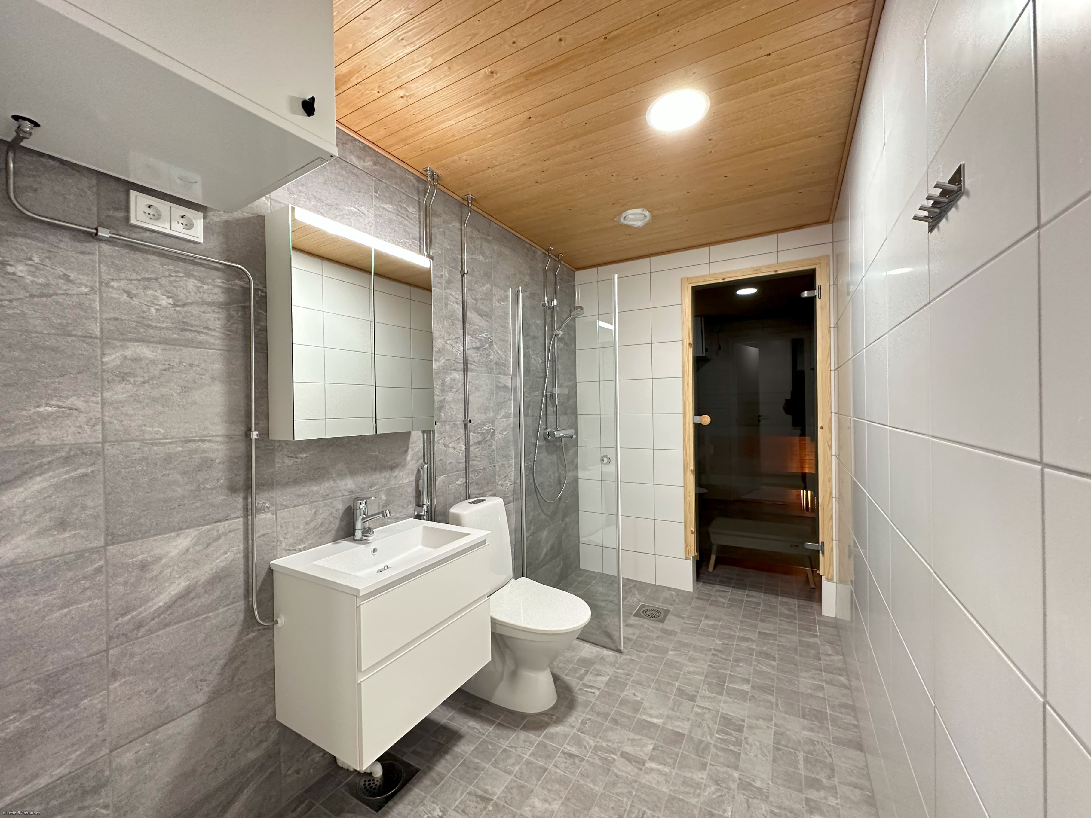 Tässä viehättävässä kodissa on laminaattilattia ja seinät vaaleaa maalipintaa. Keittiötilassa on Whirlpoolin kodinkoneet, integroitu astianpesukone, kalusteuuni, induktioliesi ja jääkaappipakastin. Laatoitetussa kylpyhuoneessa liitäntä omalle pyykkikoneelle sekä arjen luksus, oma sauna.