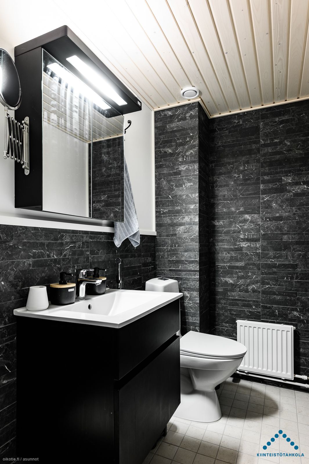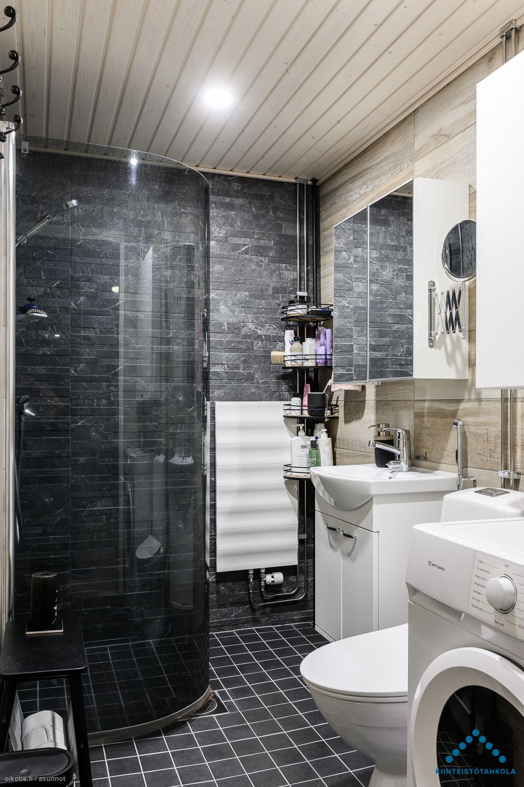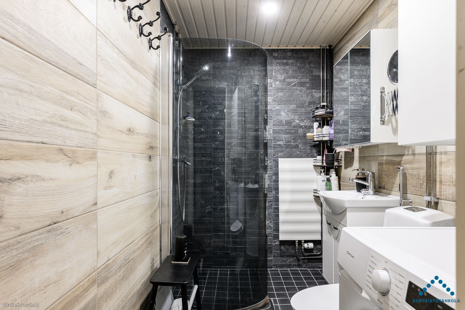 | Kylpyhuoneen varusteet | Varusteet: WC, suihku, suihkuseinä, lattialämmitys, kiinteät valaisimet, pesukoneliitäntä, allaskaappi, peilikaappi. WC: WC pesuhuoneessa sekä erillinen WC. Varusteet: peilikaappi, allaskaappi |