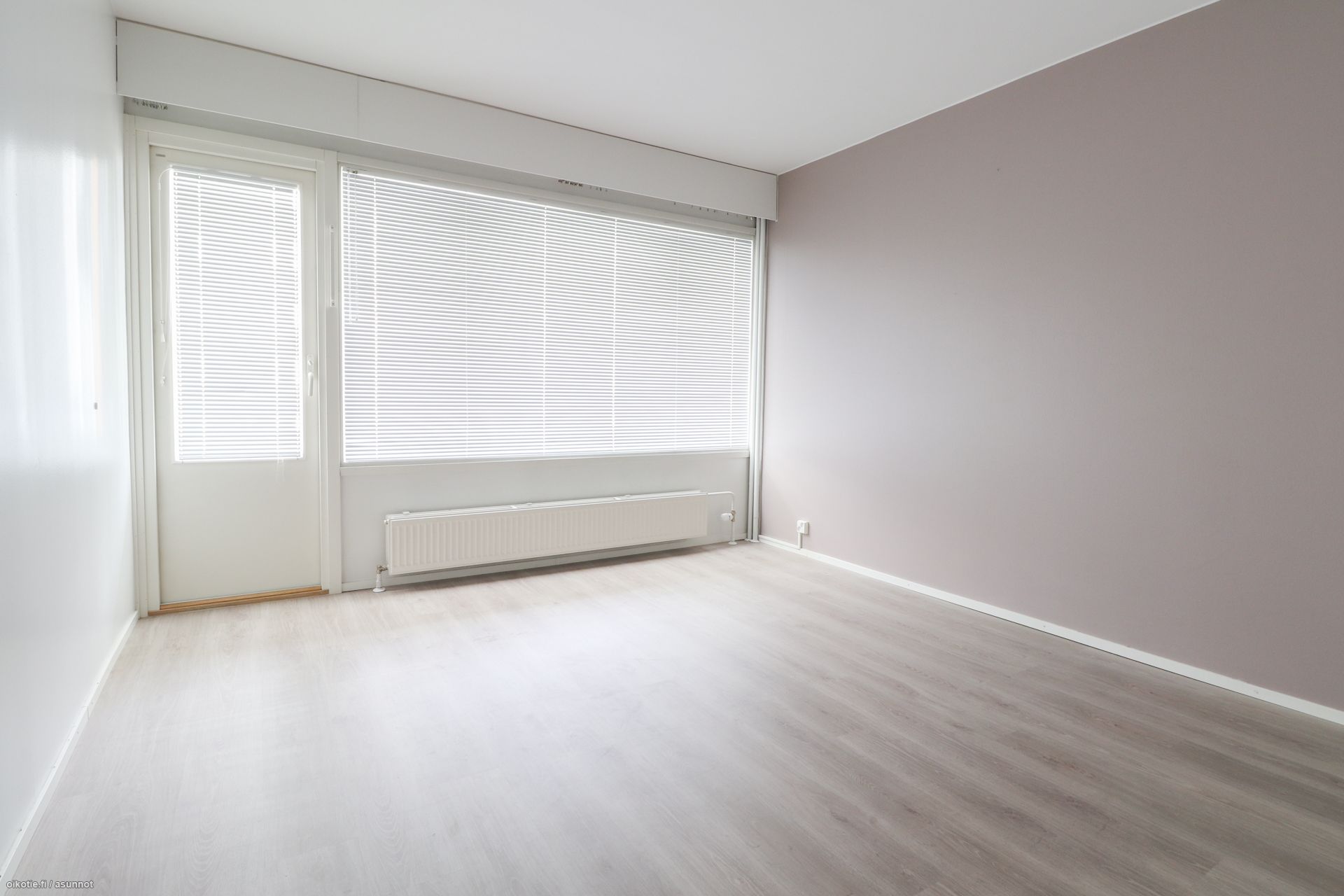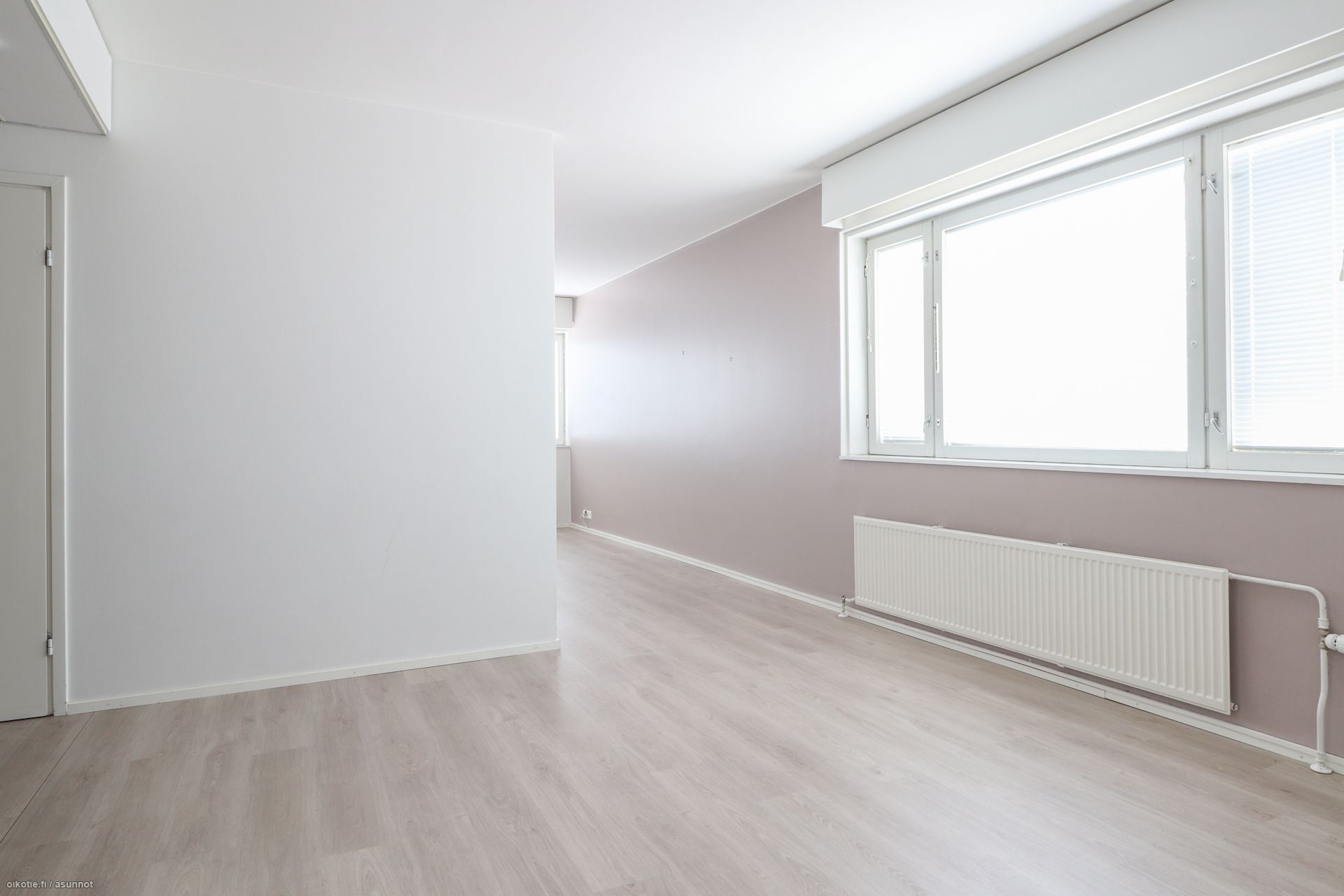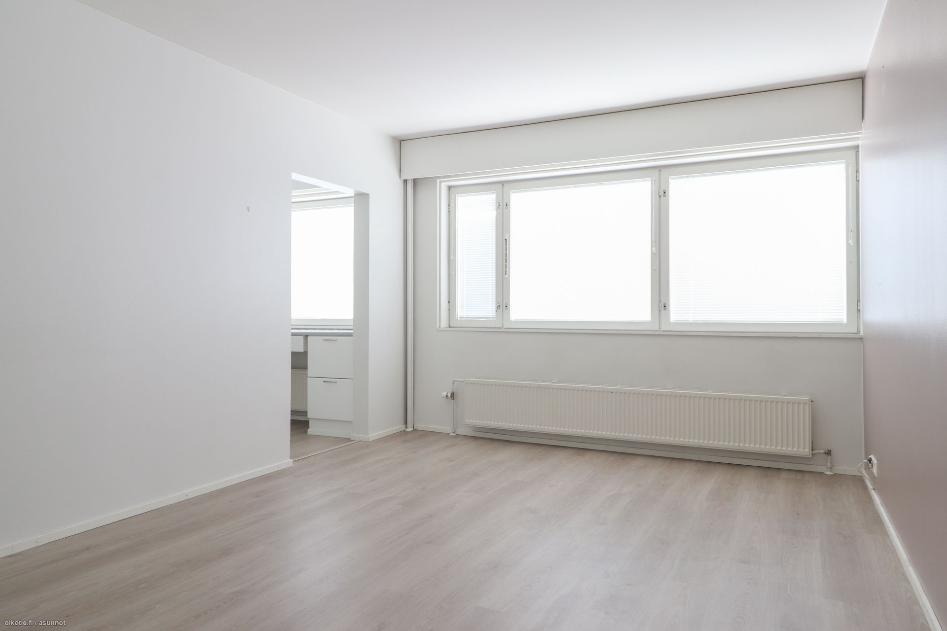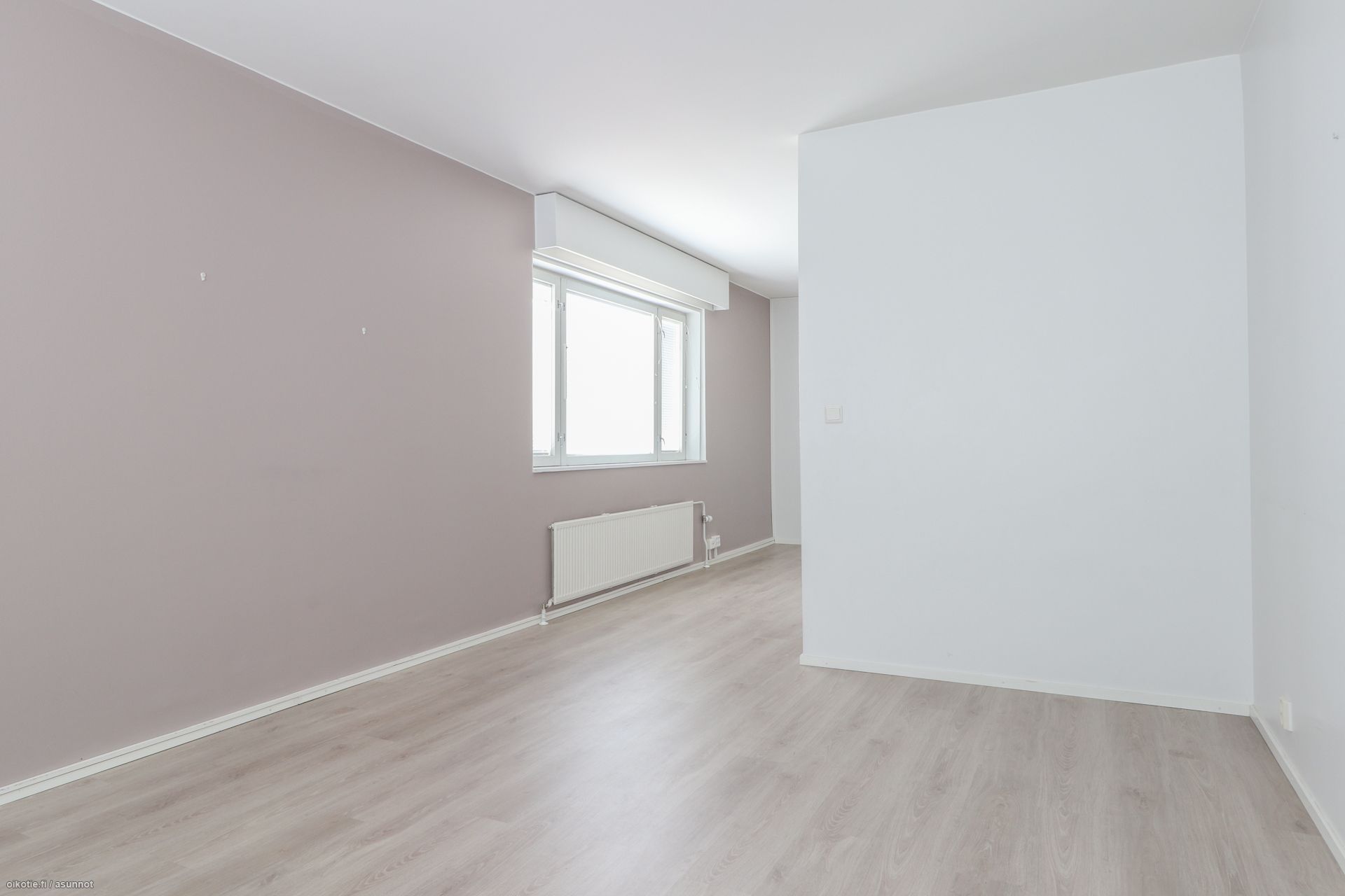 Pinnat: Huoneistossa on raikkaat vaaleat seinät ja siisti, helppohoitoinen laminaattilattia.