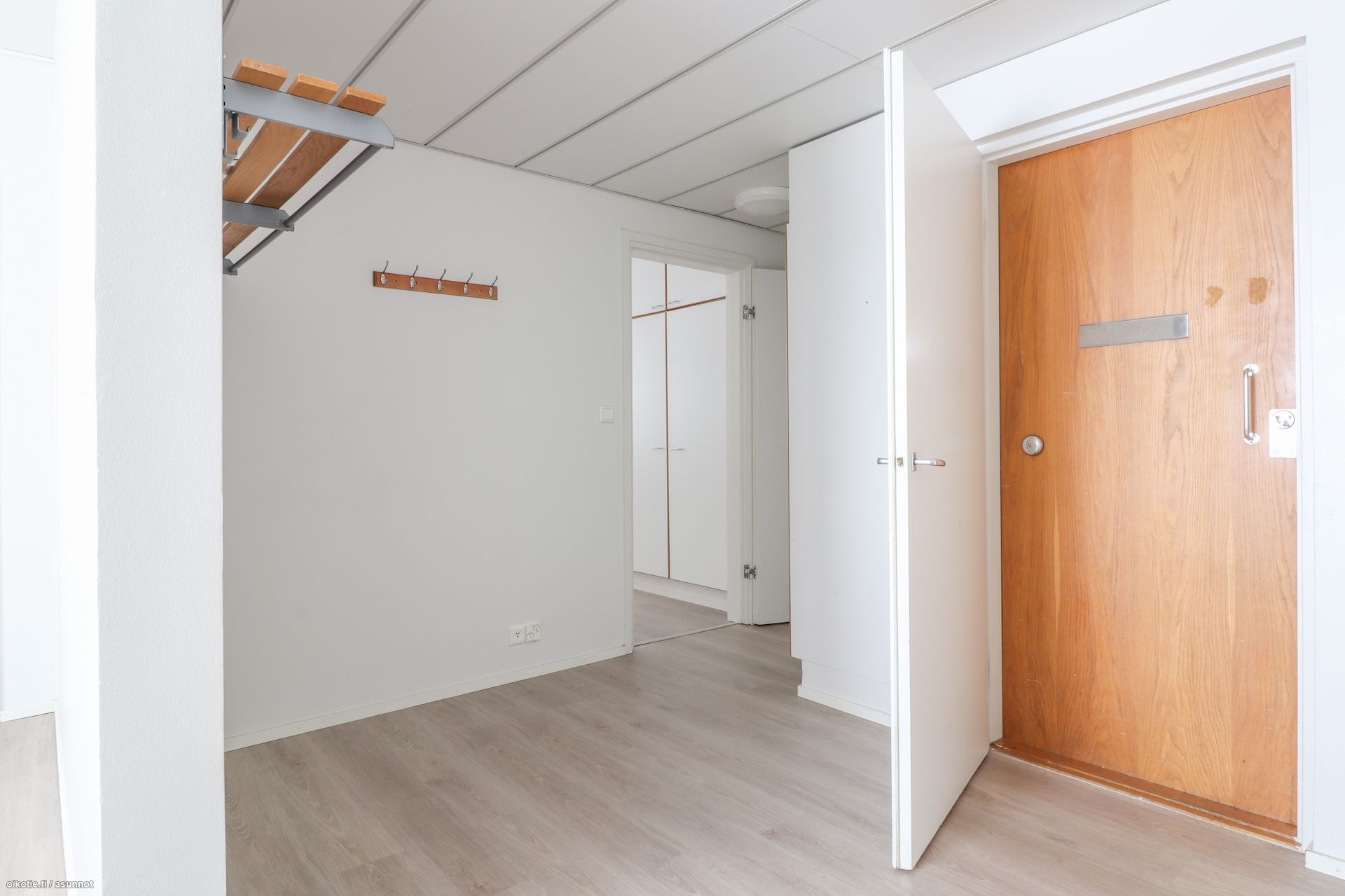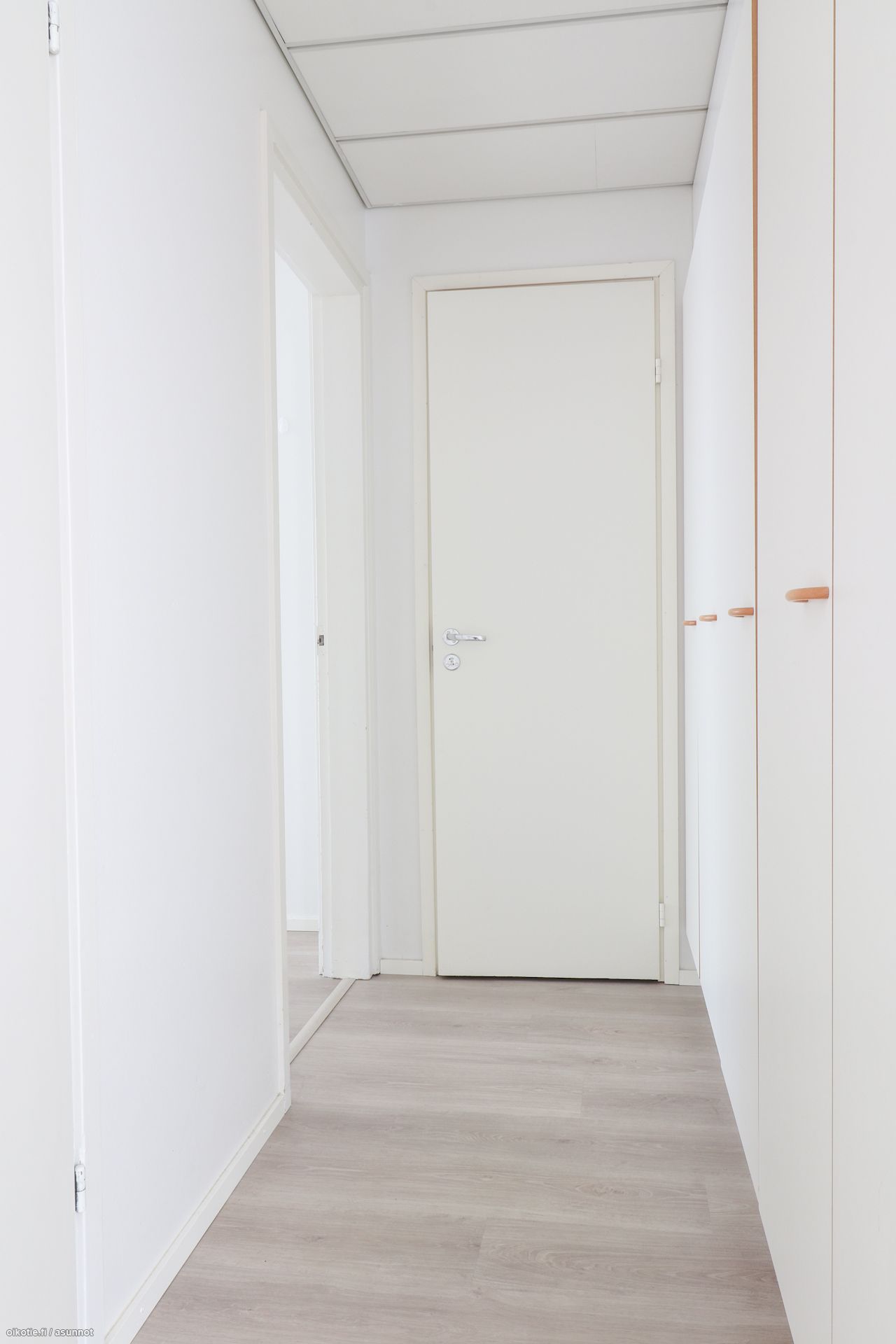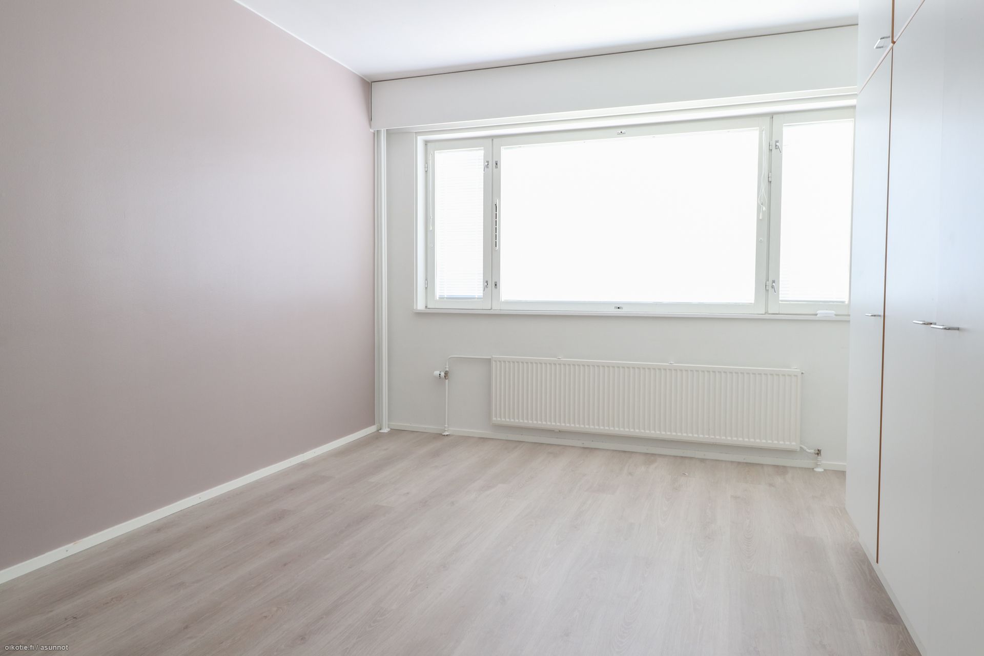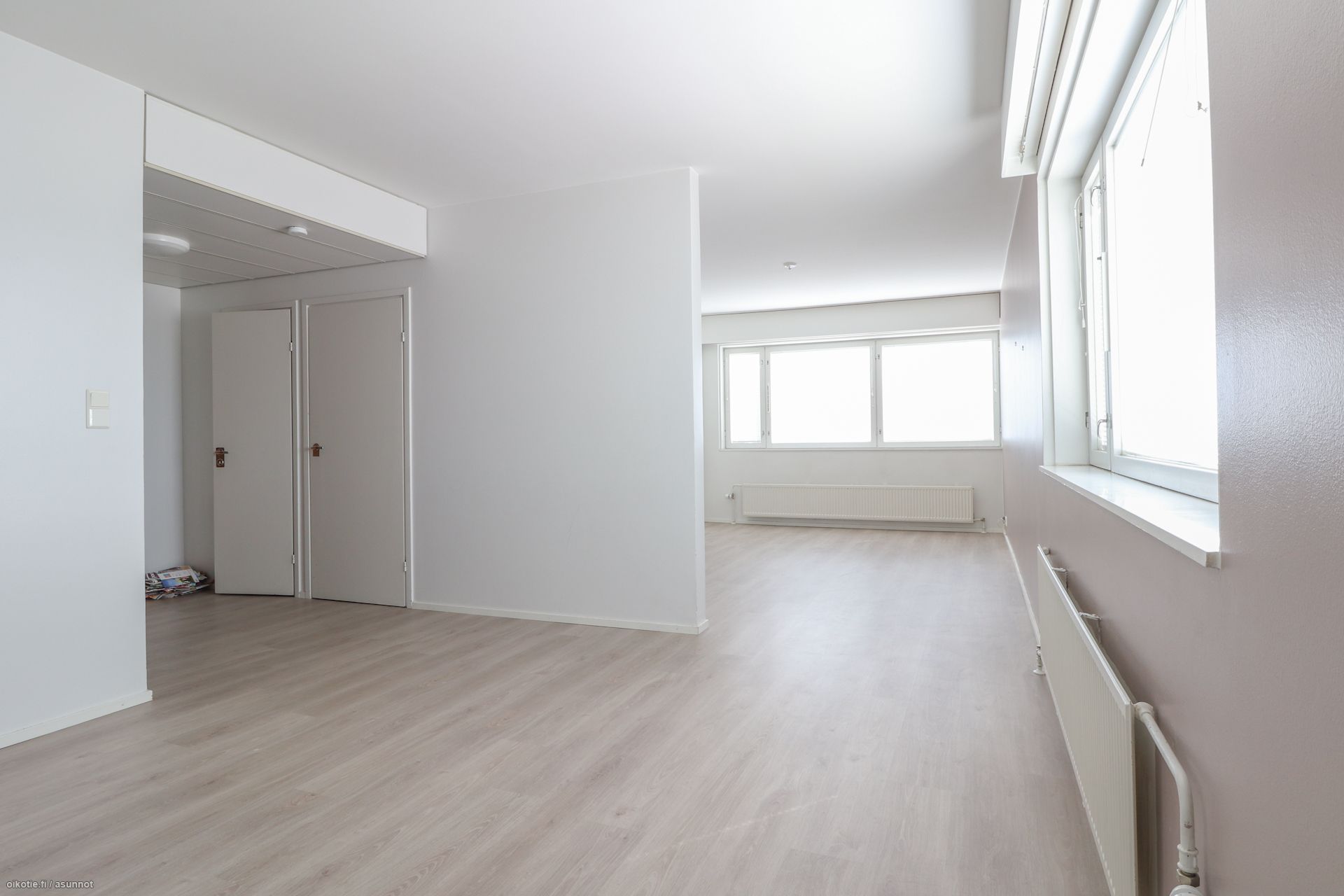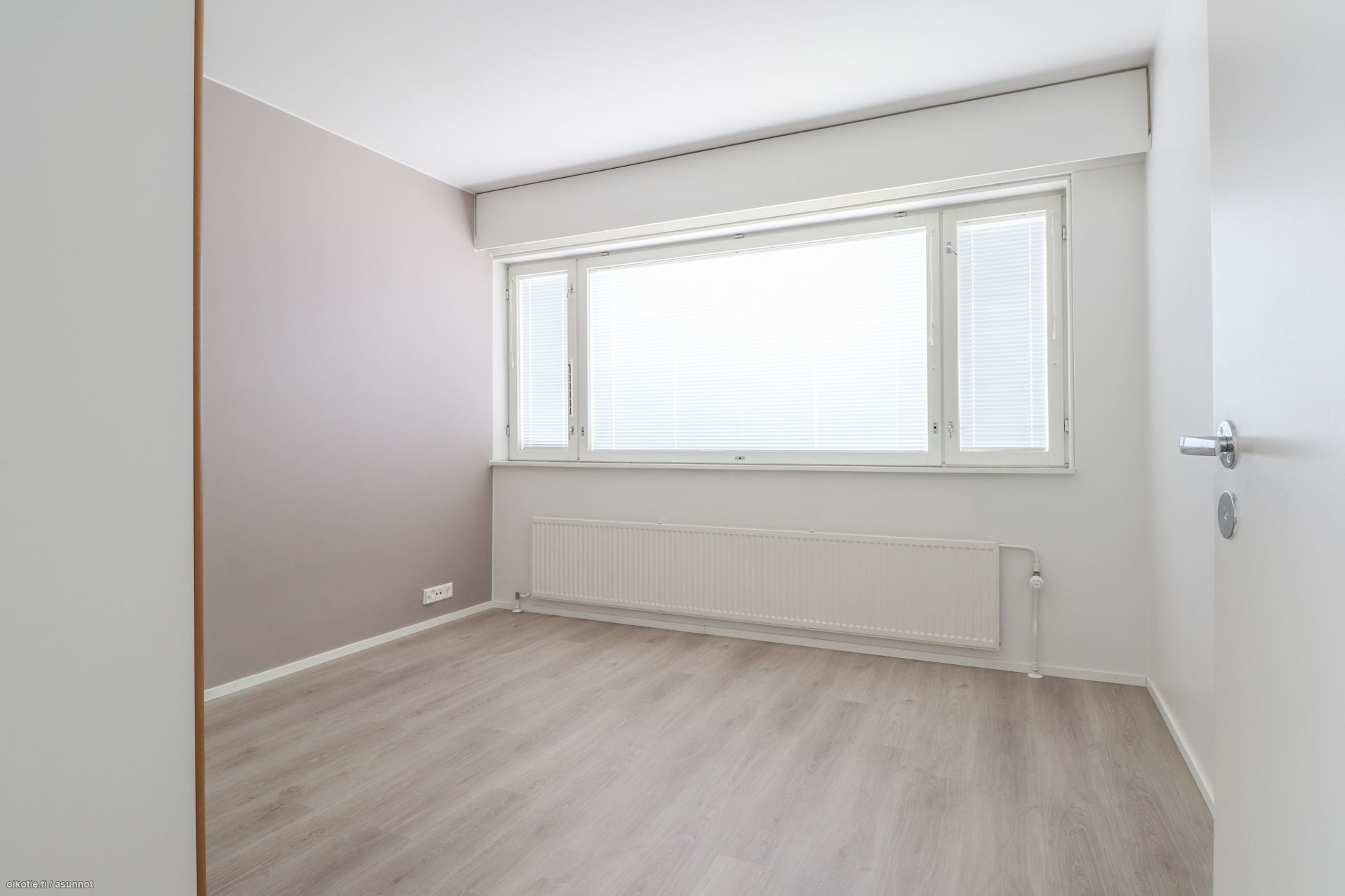 Pinnat: Huoneistossa on raikkaat vaaleat seinät ja siisti, helppohoitoinen laminaattilattia.