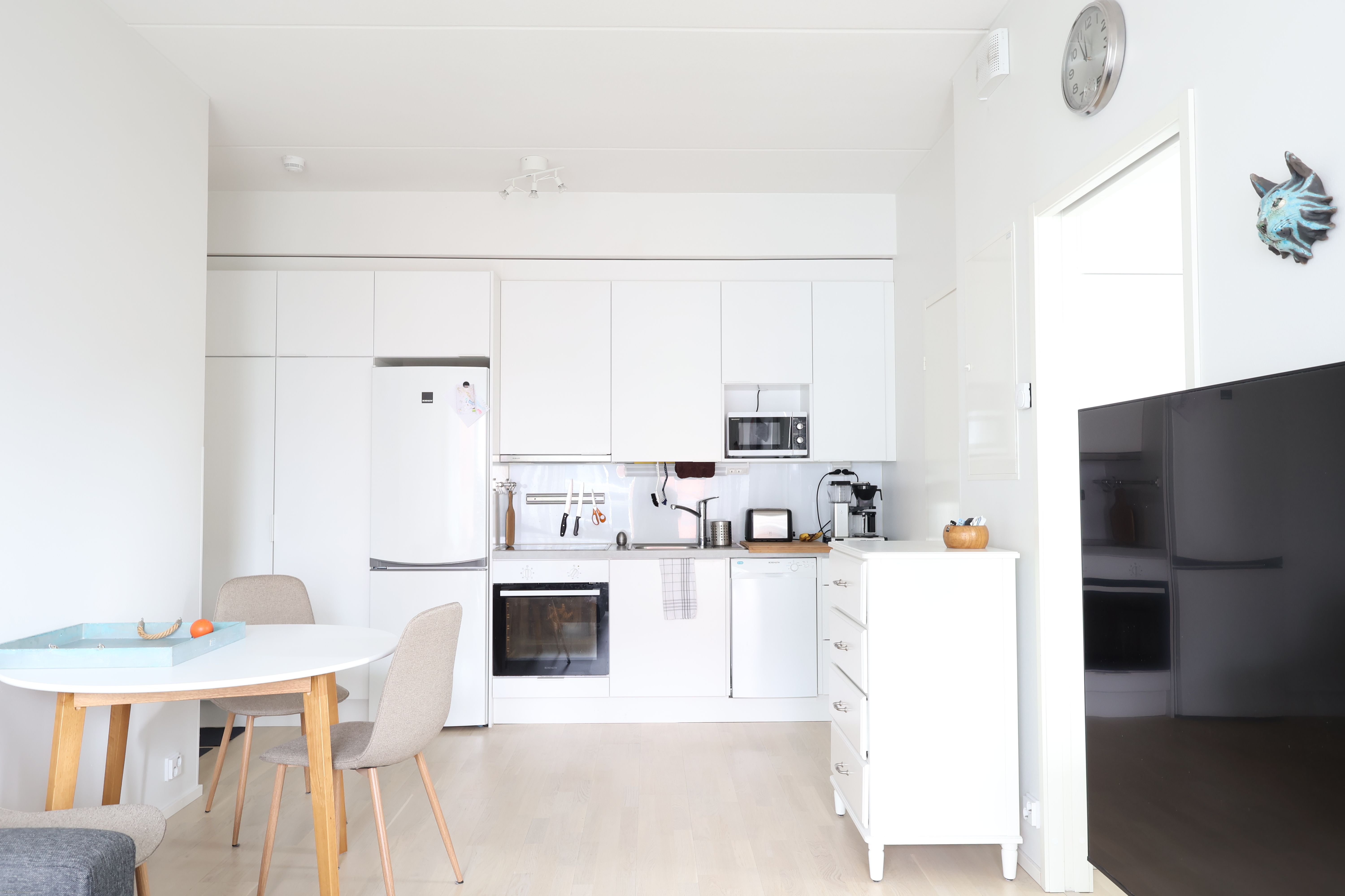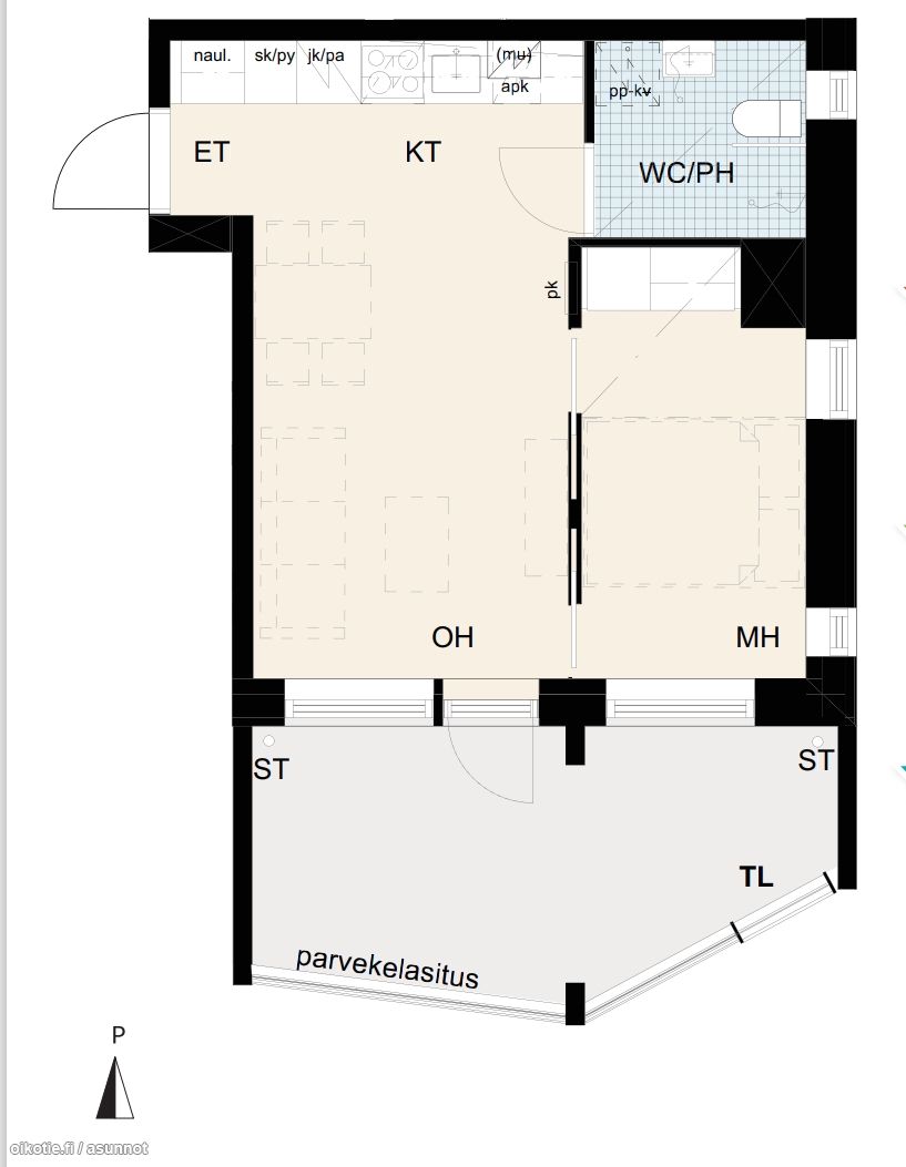 Tässä asunnossa on erittäin käytännöllinen pohjaratkaisu. Asunnossa tavallista korkeampi huonekorkeus, joka tuo avaruutta ja tilantuntua. Asunnon modernista keittiöstä löytyy mm. astianpesukone, induktioliesi, kalusteuuni, sekä jääkaappi-pakastin. Tilavasta olohuoneesta käynti tyylikkäälle lasitetulle parvekkeelle. Makuuhuoneessa hyvin säilytystilaa. Asunnon kaunis laminaattilattia ja valkoiseksi maalatut seinät helpottavat sisustamista