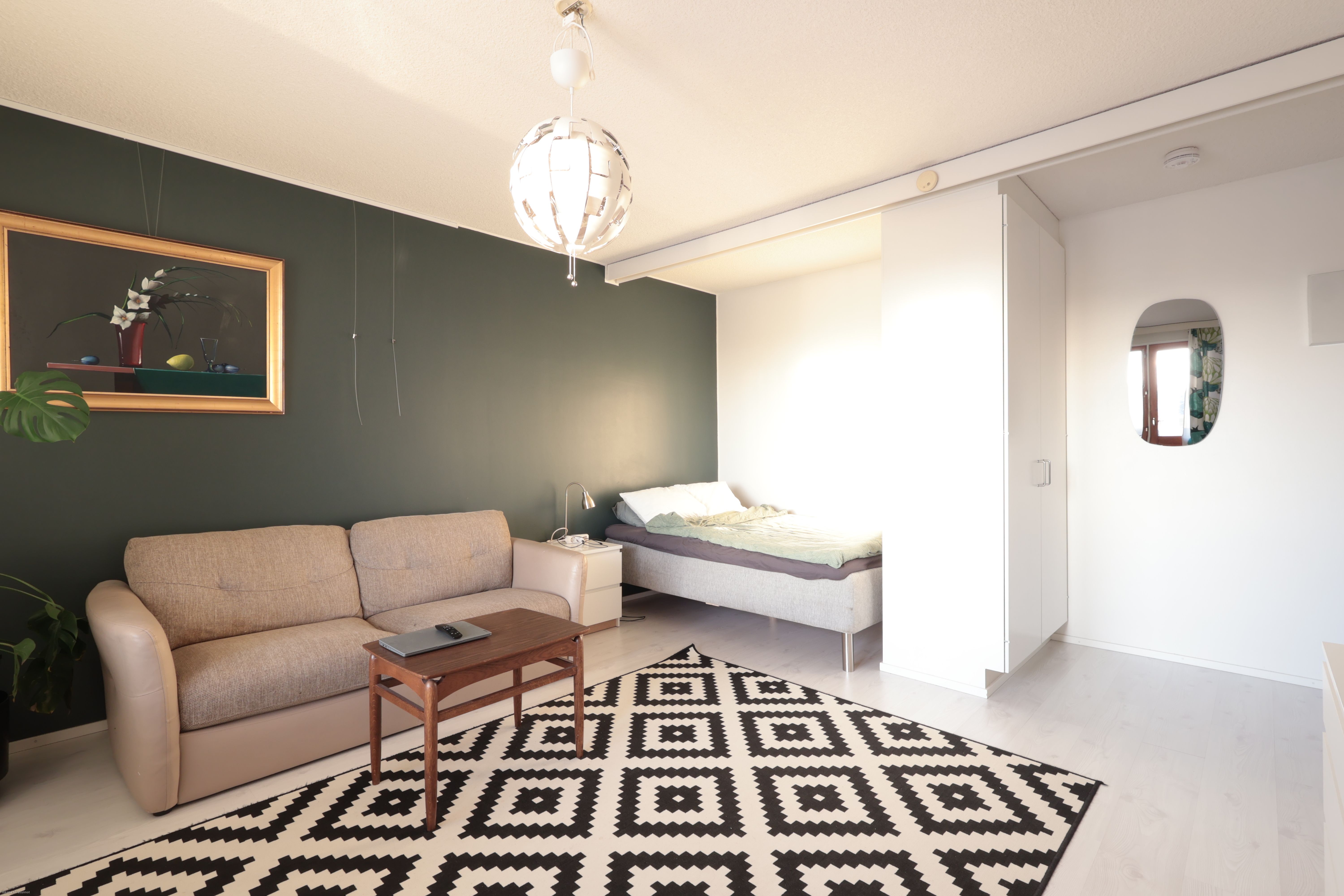 Asunnossa on erittäin toimiva ja selkeä pohjaratkaisu. Keittiö on omassa erillisessä tilassaan, mikä tekee oleskelualueesta rauhallisen ja helpottaa kalustamista. Alkovi tuo makuutilaan mukavasti omaa suojaa ja mahdollistaa selkeän jaon nukkumis- ja oleskelutilan välillä.
