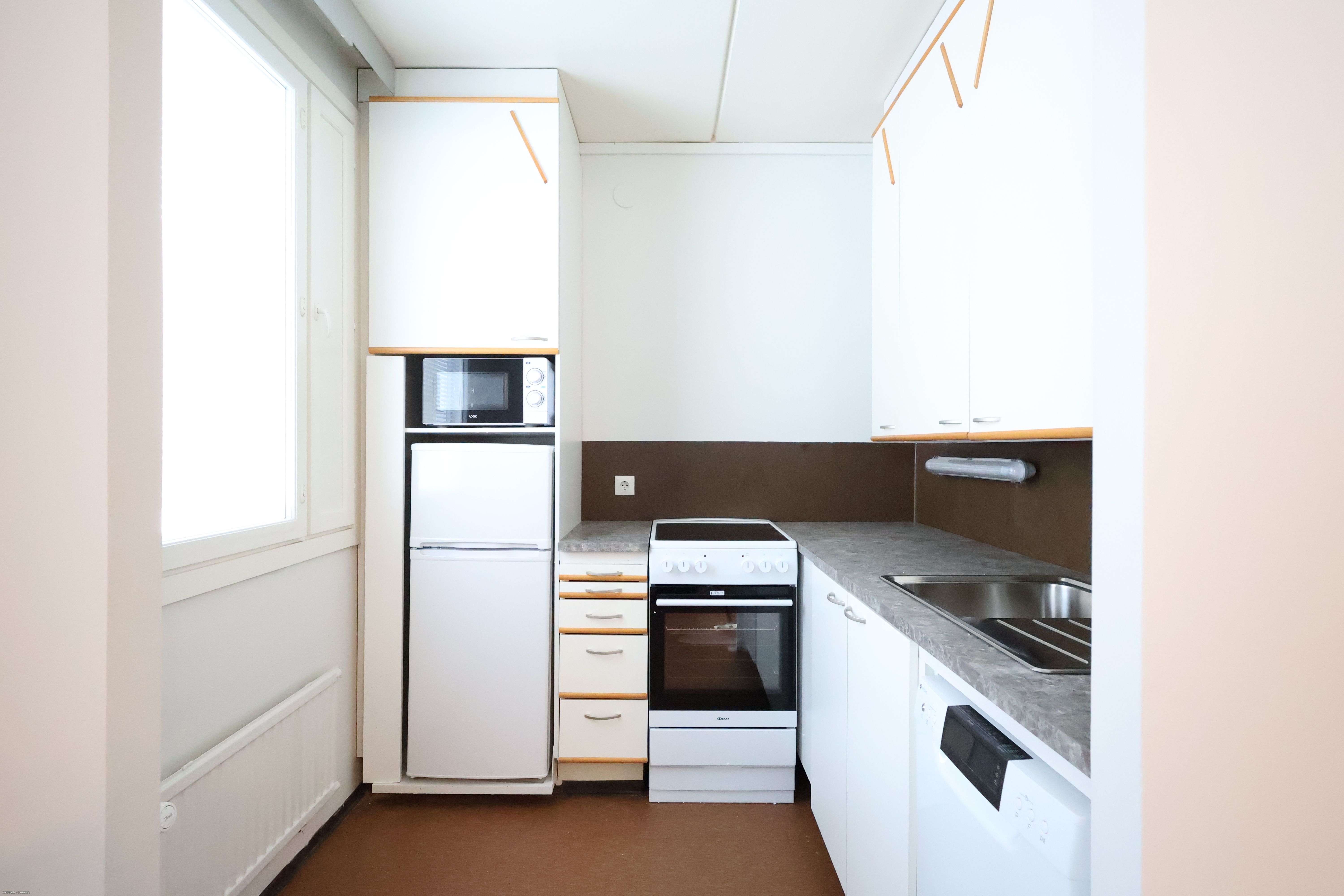 Keittiöstä löytyy astianpesukone ja mikroaaltouuni jotka helpottavat arkea. Keittiössä myöskin uusi keraaminen liesi ja uuni. Oleskelutilan yhteydessä oleva alkovi tuo selkeän ja rauhallisen paikan sängylle, jolloin muu tila jää mukavasti käyttöön. Kaappitilaa löytyy runsaasti! Kylpyhuoneessa on liitäntä ja paikka omalle pyykinpesukoneelle.