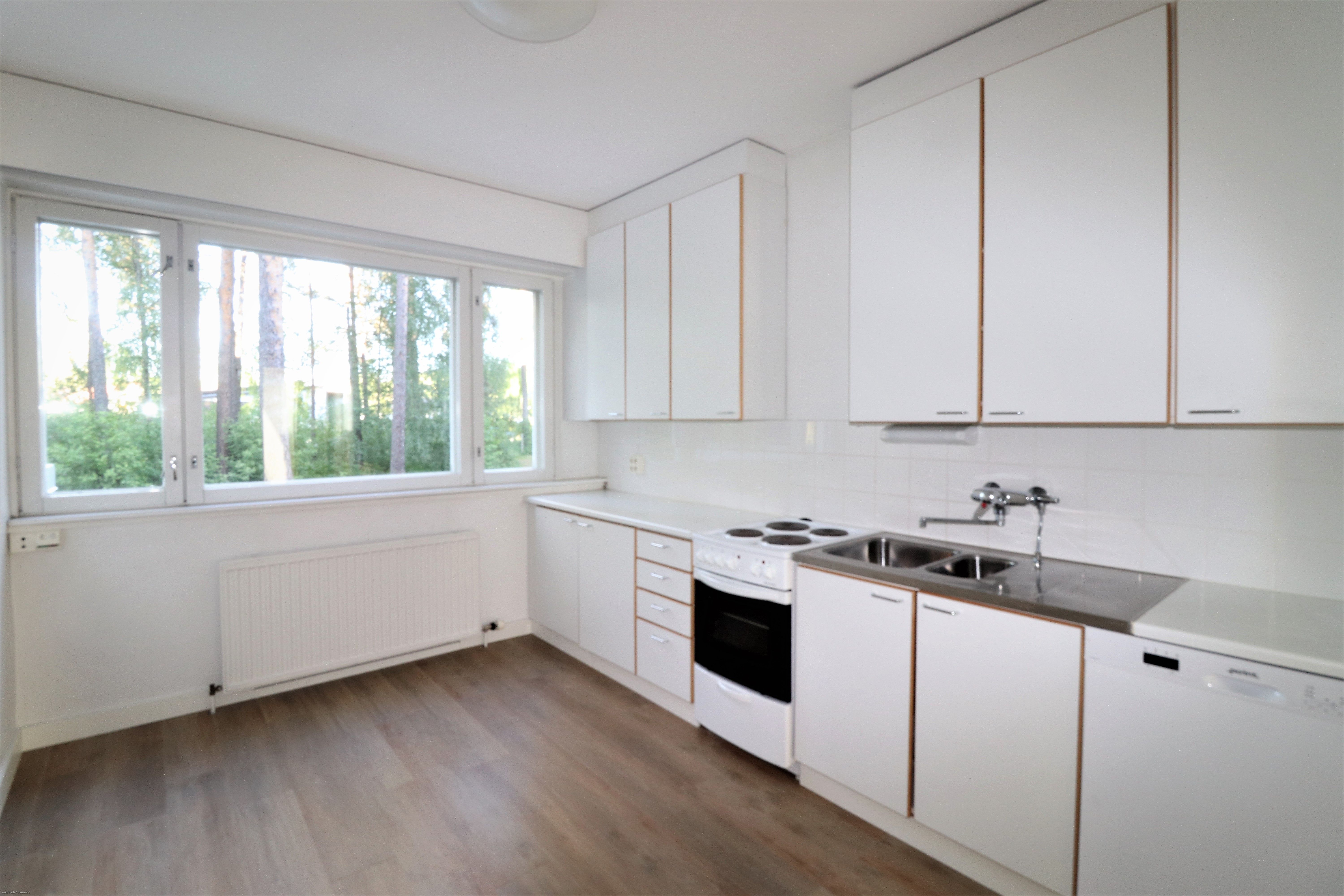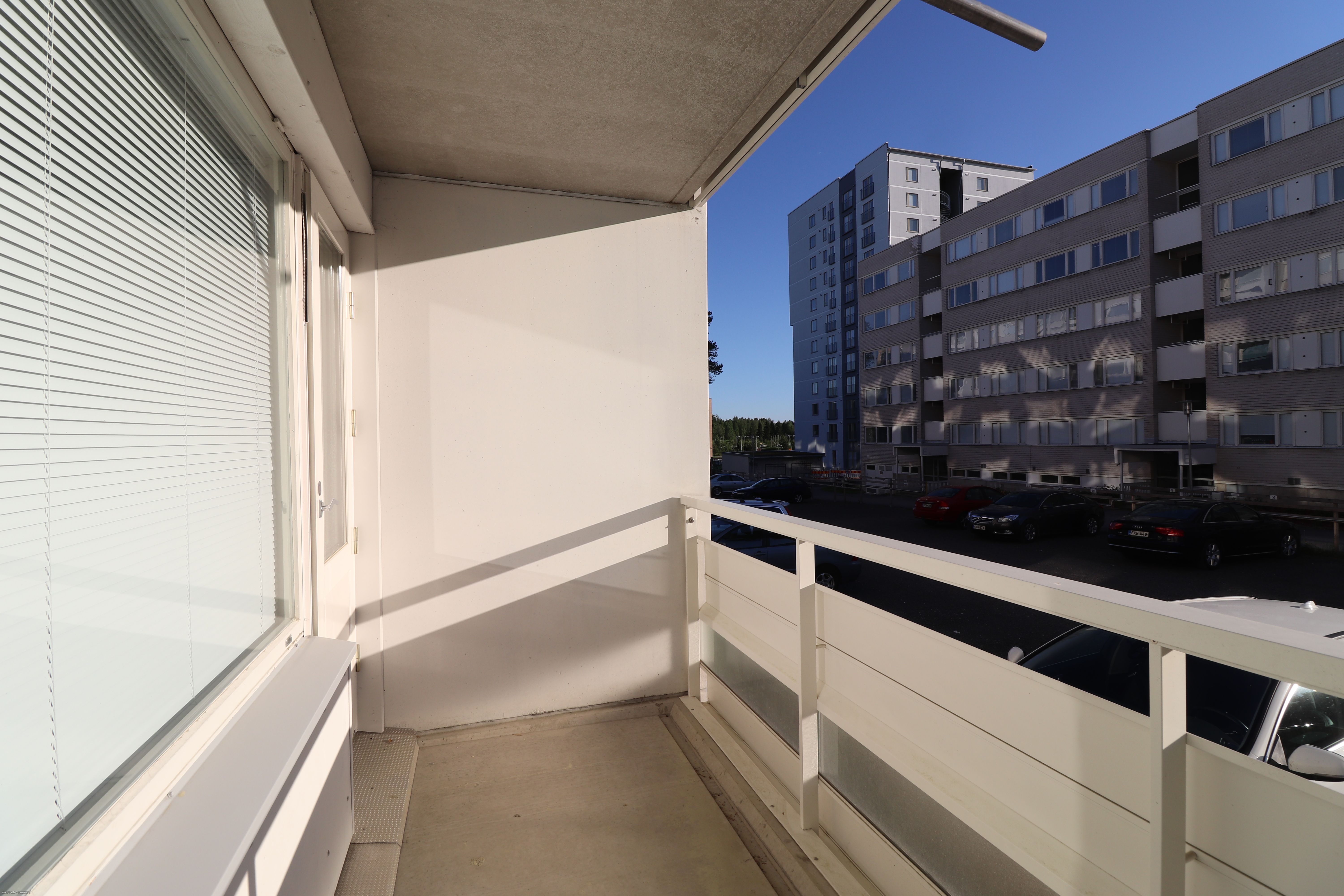 Asunnon seinät valkoisilla maalipinnoilla ja lattiaan laitettu juuri laminaatti. Keittiö varustukseen kuuluu astianpesukone, jääkaappi/pakastin, liesi, uuni sekä paljon säilytystilaa. Kylpyhuoneessa suihkukaappi ja sieltä löytyy myös pyykkikoneelle liitäntä. Asunnossa on myös oma parveke lisäämässä asumisviihtyisyyttä. Asunnossa mukavasti säilytystilaa!