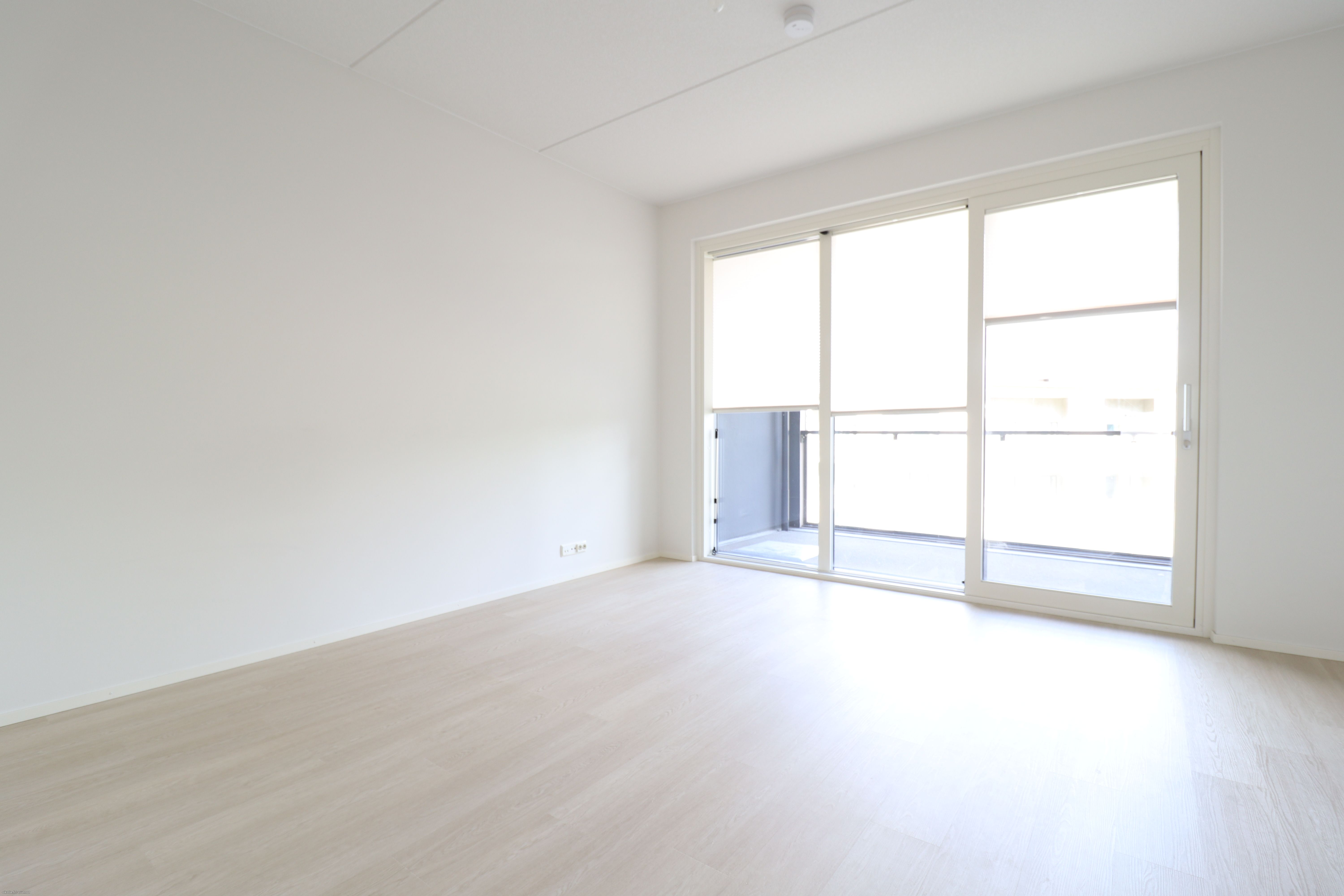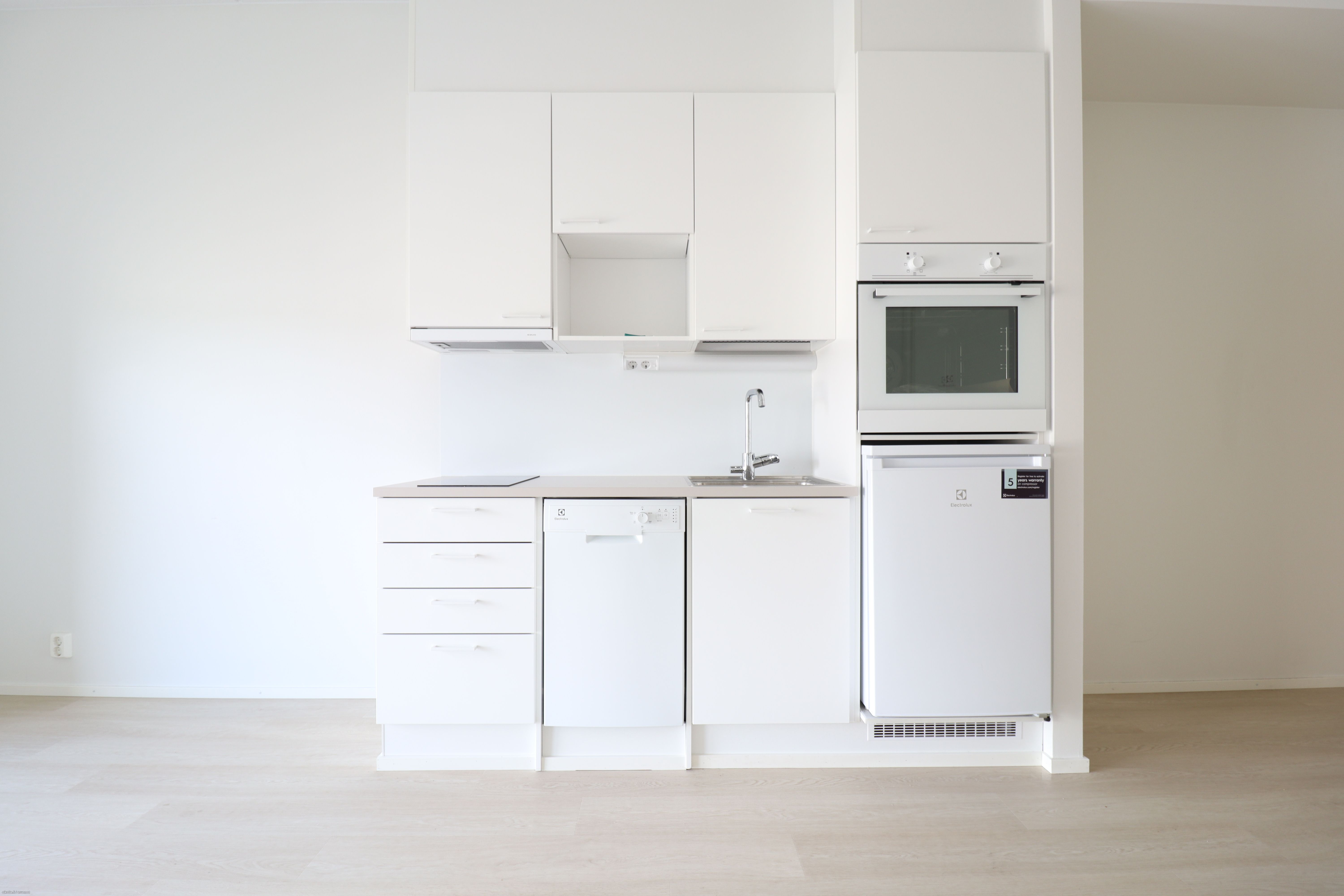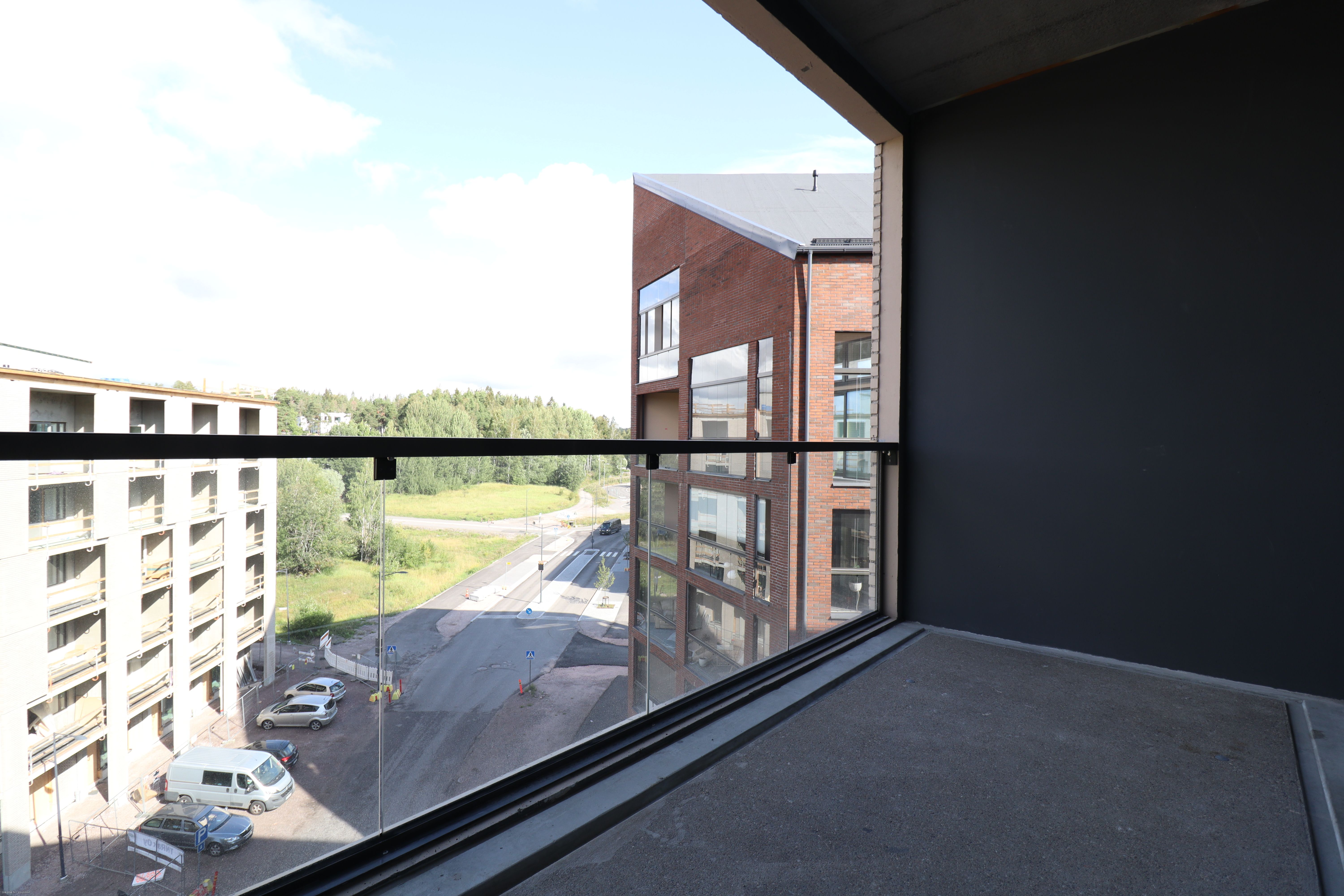 Asunnon lattia on tammilautaparkettia ja seinät raikkain maalipinnoin. Keittiöstä löytyy seuraavat kodinkoneet: astianpesukone, kalusteuuni, kahden levyn keraaminen liesitaso sekä jääkaappi pakastelokerolla. Tilavassa kylpyhuoneessa on liitäntä pyykinpesukoneelle. Todella tilava parveke on kuin yksi huone lisää.