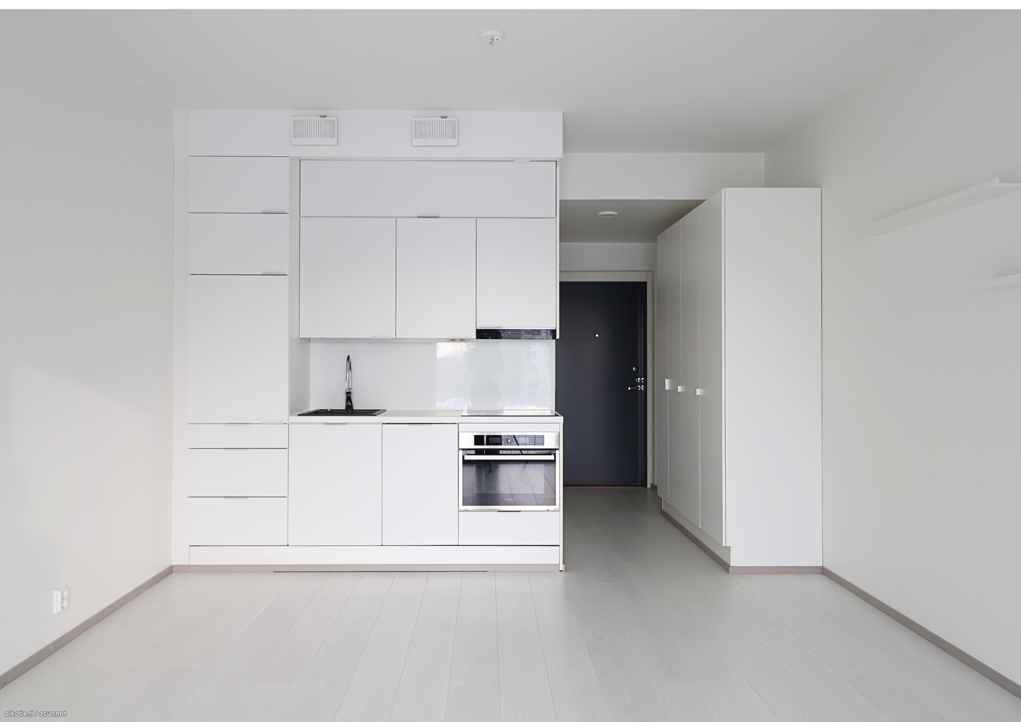 Asunnossa on toimiva ja kompakti pohjaratkaisu. Modernista keittiöstä löytyvät integroituna astianpesukone, jääkaappi ja pakastin sekä uuni ja liesi. Kylpyhuoneessa on paikka ja liitäntämahdollisuus pyykinpesukoneelle. Eteisestä löytyy mukavasti kaappitilaa.