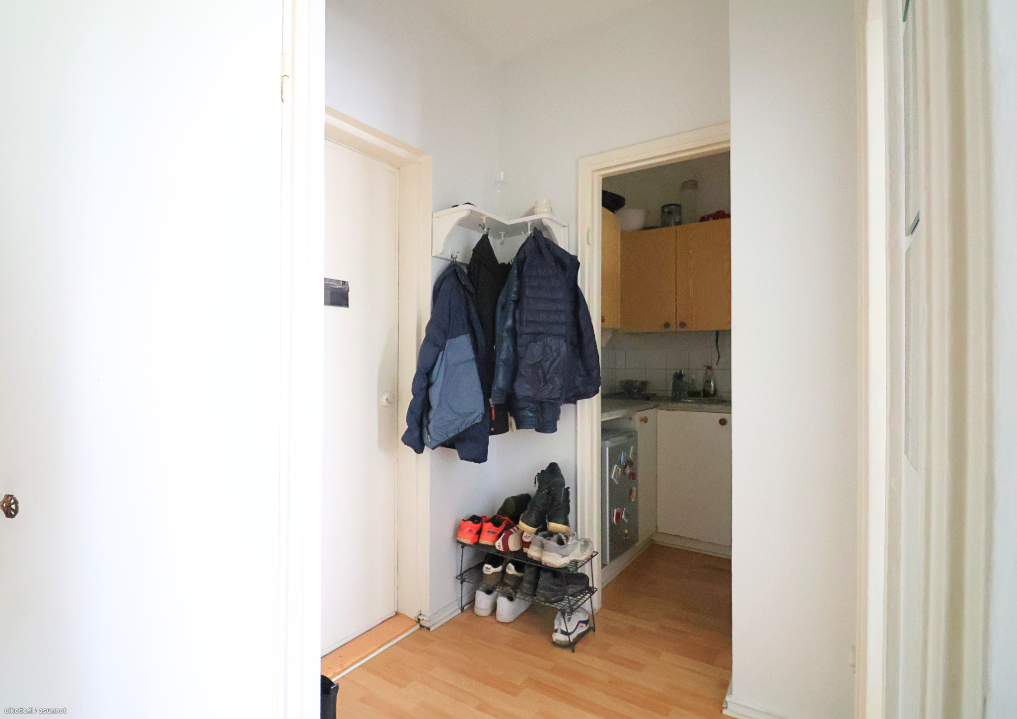 Asunnossa tullaan eteiseen, josta kulku kahteen erilliseen huoneeseen sekä keittiöön ja kylpyhuoneeseen. Keittiöstä löytyy jääkaappi pakastinlokerolla, uuni sekä kaasuliesi. Asunnon pinnat ovat hyvässä kunnossa, seinät ovat vastikään maalattu. Kylpyhuoneesta löytyy paikka ja liitännät pyykinpesukoneelle.