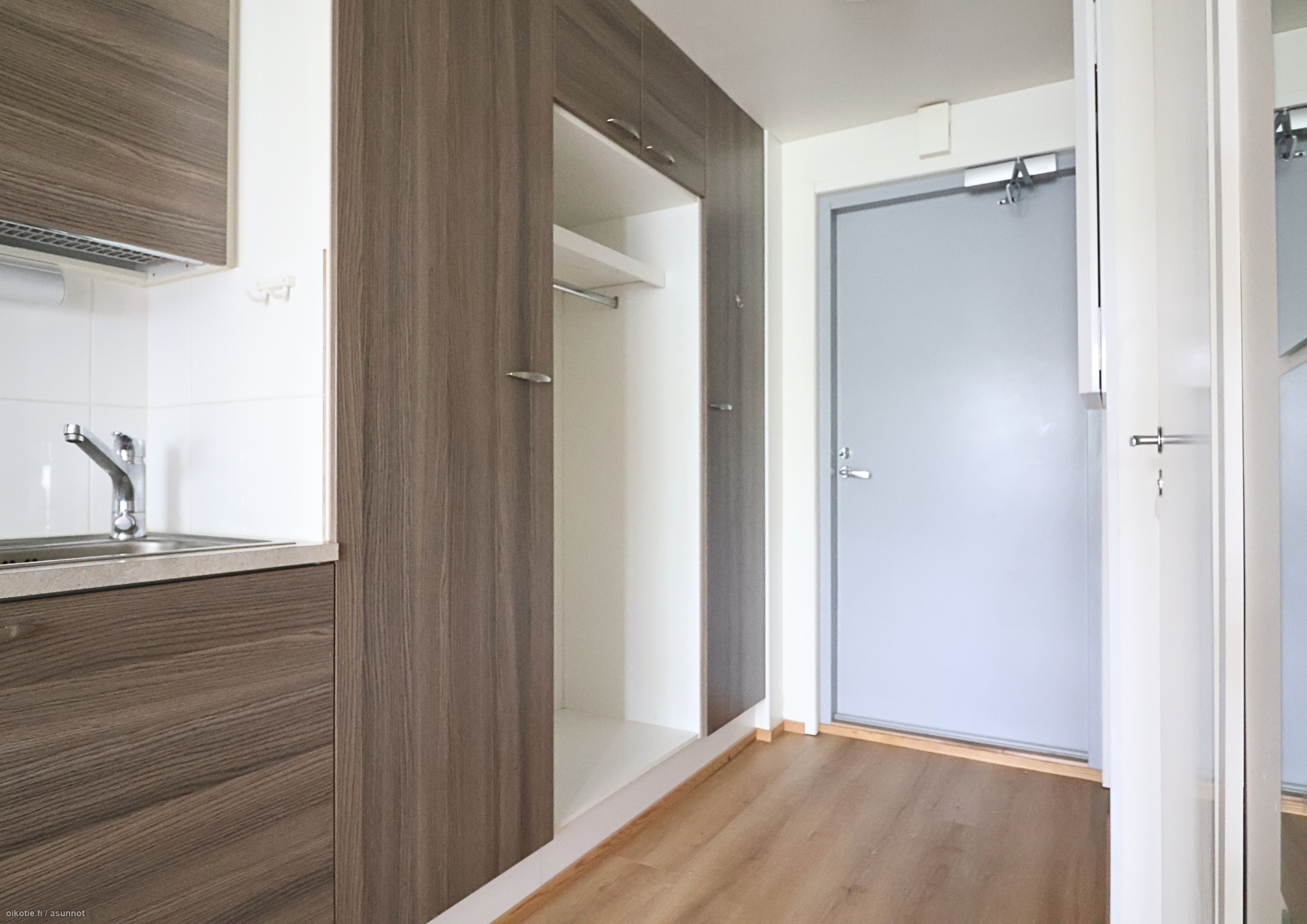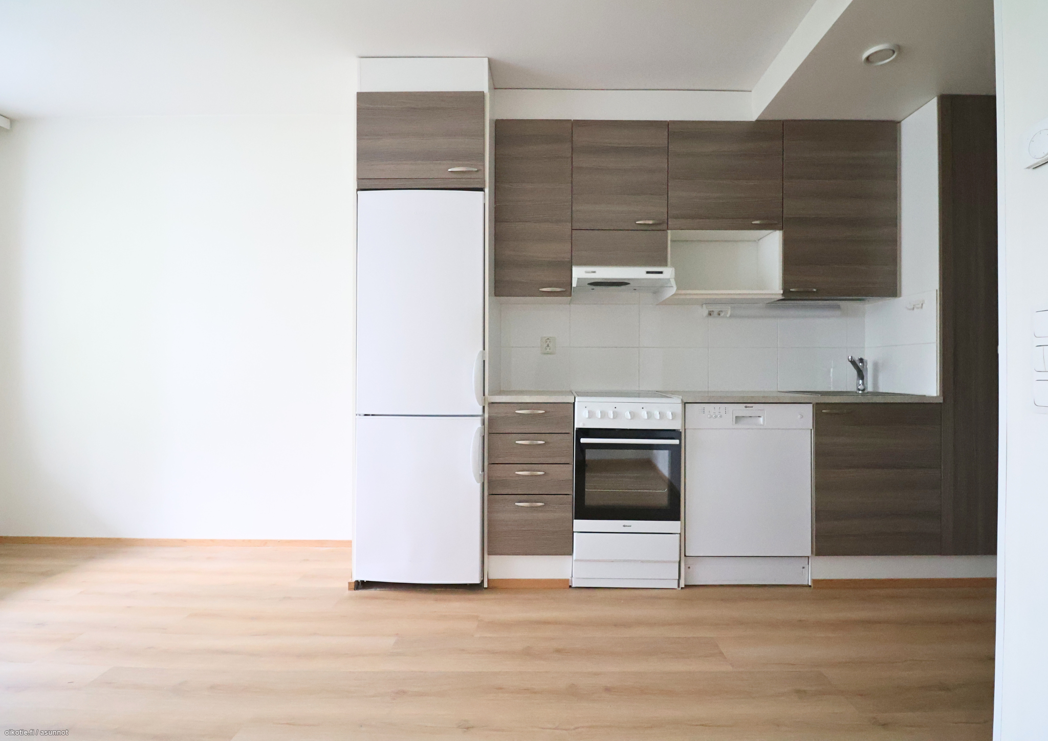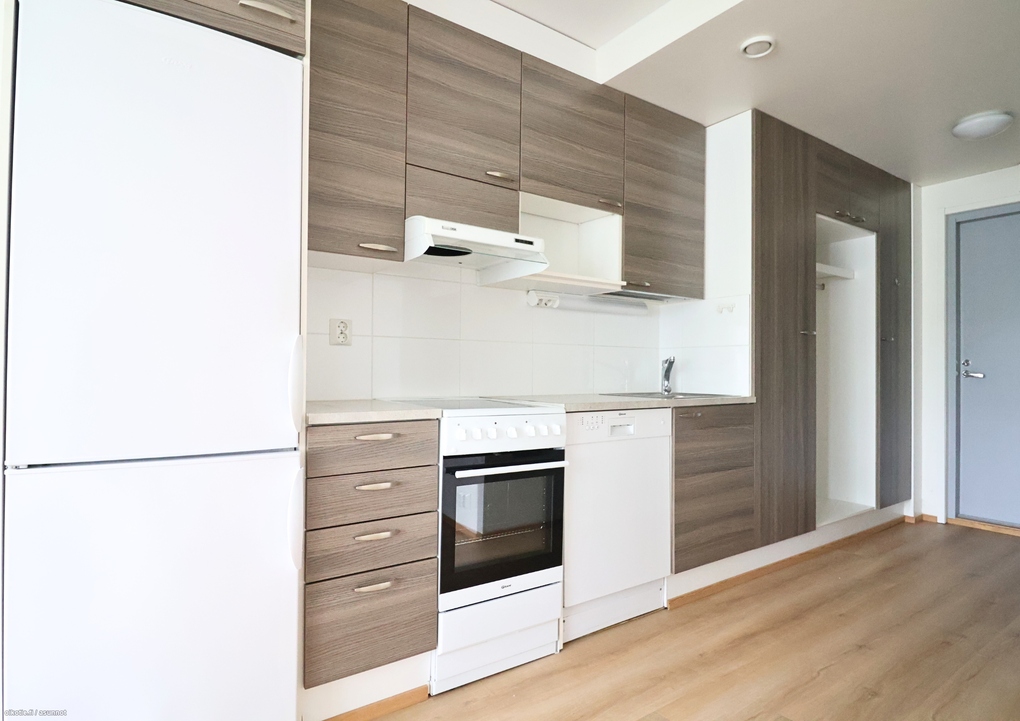 Tässä kodikkaassa yksiössä on tyylikäs keittiö nykyaikaisilla kodinkoneilla. Keittiön varusteluun kuuluvat astianpesukone, uuni ja liesi sekä jääkaappi-pakastin. Asunnon seinät ovat valkoisella maalipinnalla ja lattia on laminaattia. Oma terassi tuo lisämukavuutta asumiseen. Kylpyhuone on tilava ja sieltä löytyy paikka ja liitännät pyykinpesukoneelle. Viihtyisästä taloyhtiöstä löytyy jokaiselle asunnolle irtaimistovarasto.