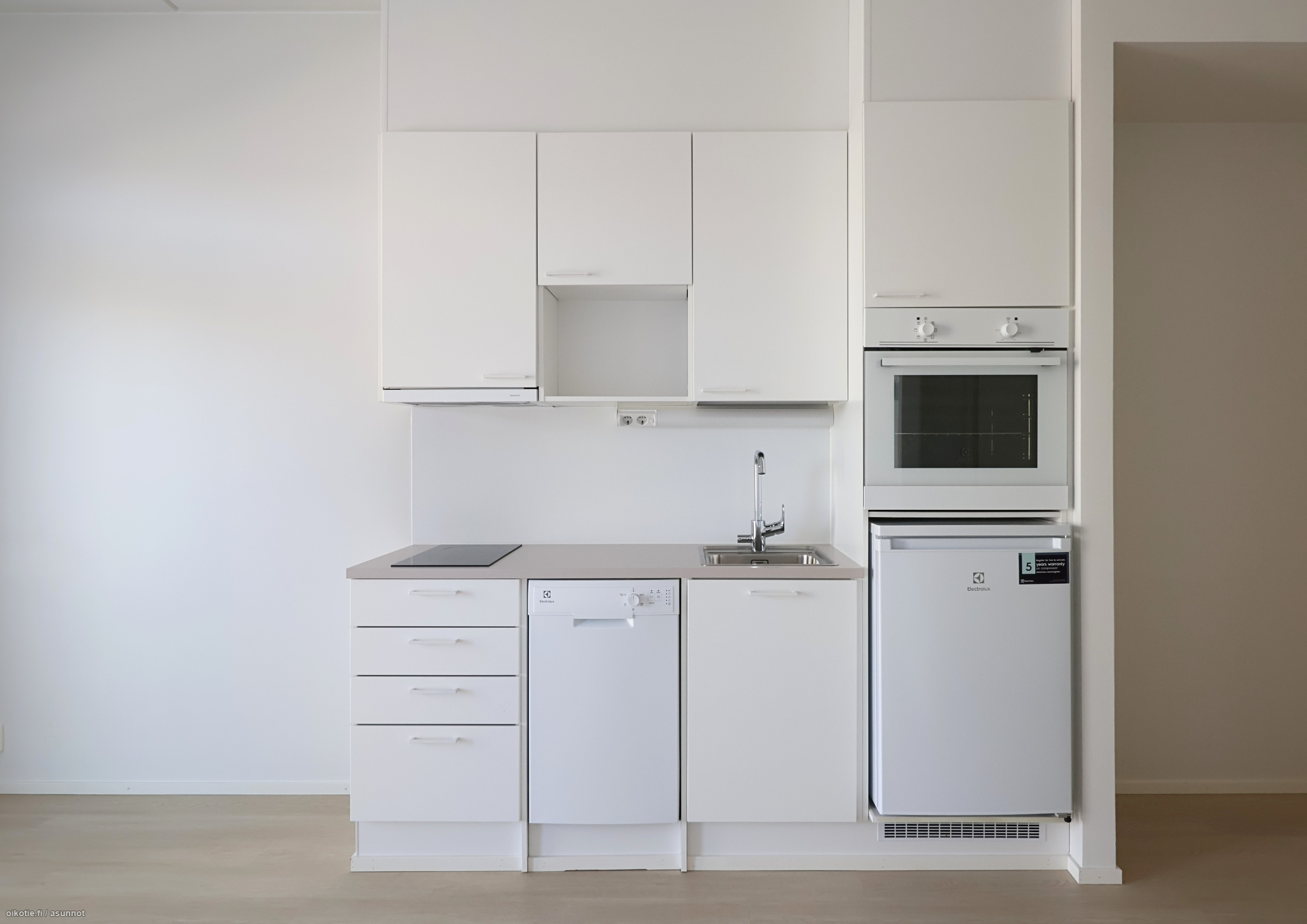 Tavanomaista korkeampi huonekorkeus ja suuret ikkunat tekevät asunnosta avaran ja valoisan. Lasitetulla parvekkeella kelpaa nauttia aamukahvit, sillä tilanpuutteesta ei tarvitse kärsiä. Integroituihin kodinkoneisiin lukeutuu jääkaappi pakastelokerolla, keraaminen liesi, erillisuuni sekä astianpesukone. Tilavassa ja modernissa kylpyhuoneessa on tilavaraus pyykinpesukoneelle.
