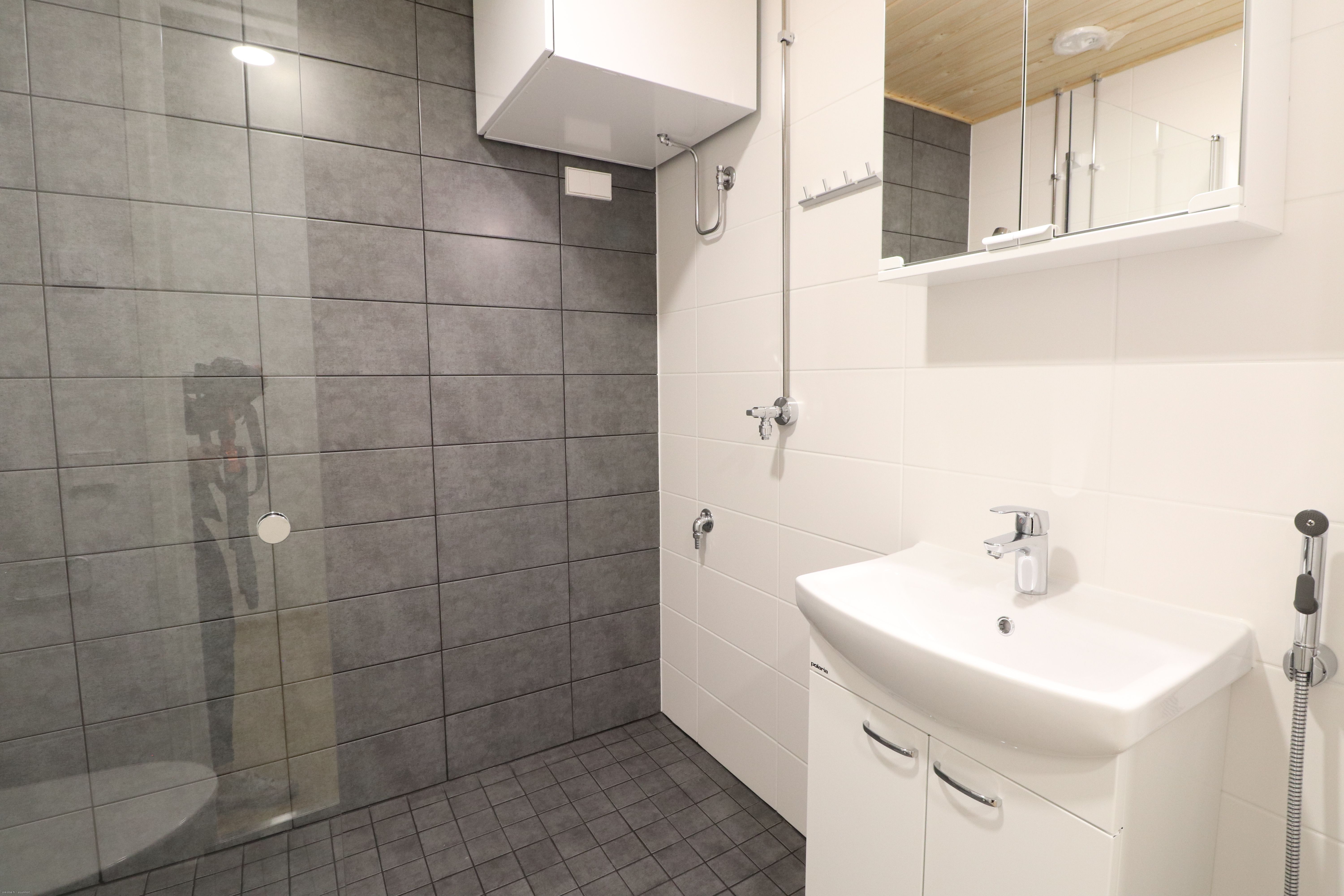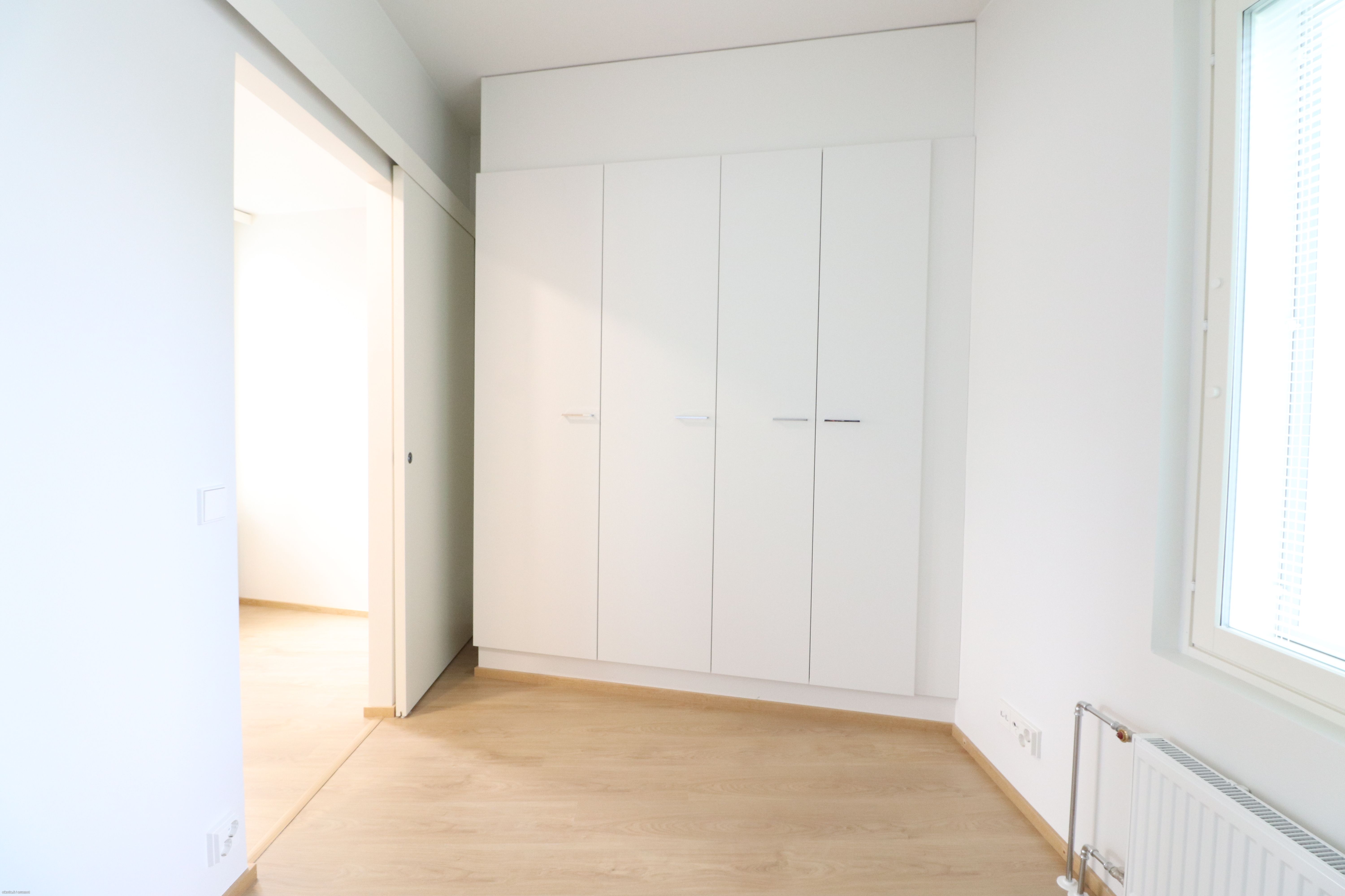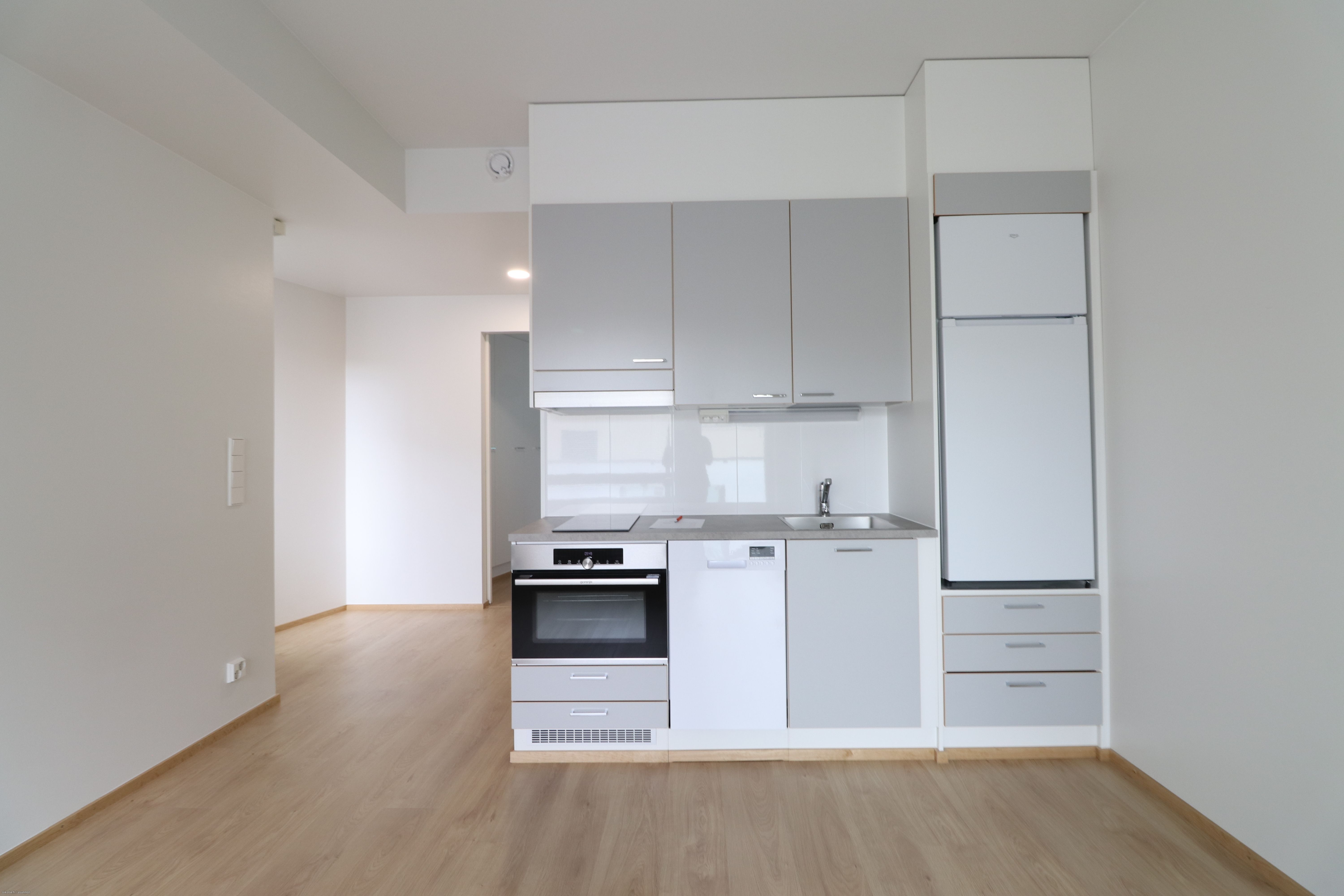Tämän viidennen kerroksen kivan kaksion sisustusmateriaalit ovat tyylikästä vaaleaa värimaailmaa, valkoiset maalatut seinät ja lattiat laminaattia. Keittiötilasta löytyy nykyaikainen koneistus, jenkkikaappi, keraaminen liesi ja astianpesukone. Kaakeloidussa kylpyhuoneessa on paikka omalle pyykkikoneelle.