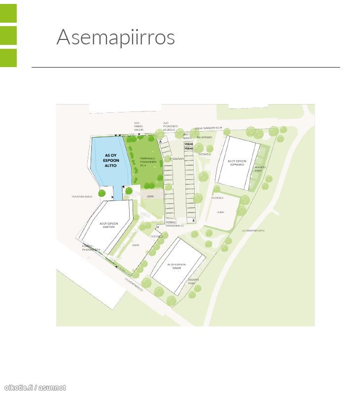 As Oy Espoon Altto sijaitsee Espoon sydämmessä, vehreän keskuspuiston ja vilkkaiden kulkuyhteyksien risteyskohtaan. Naapurissasi sijaitsee Suurpelto harrastusmahdollisuuksineen ja kaikki tarvittavat palvelut löytyvät kävelyetäisyydeltä. Lähikauppaan pyöräilee kolmessa minuutissa ja Iso Omenan palvelut saavutettavissa myös helposti. Omalla autolla pääset liikkumaan joka suuntaan helposti.