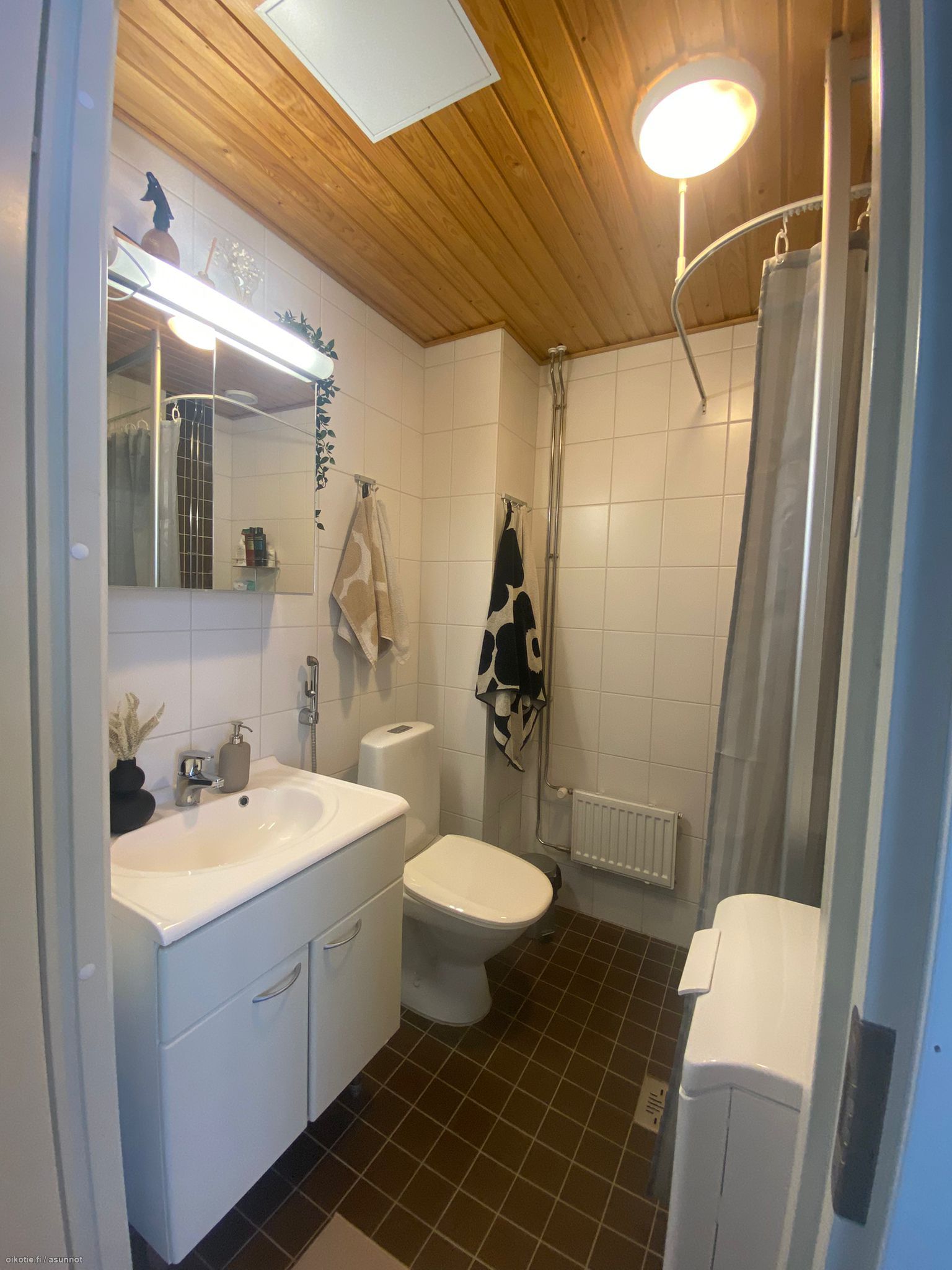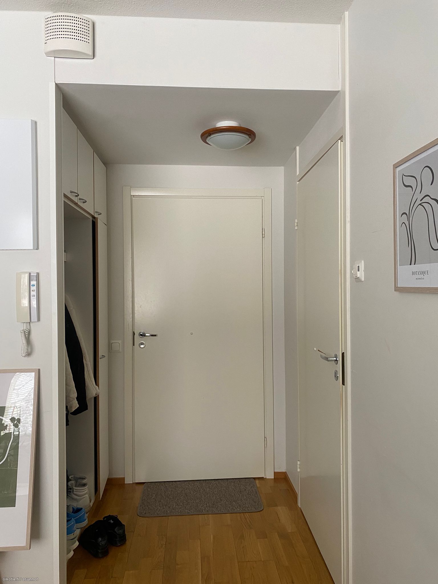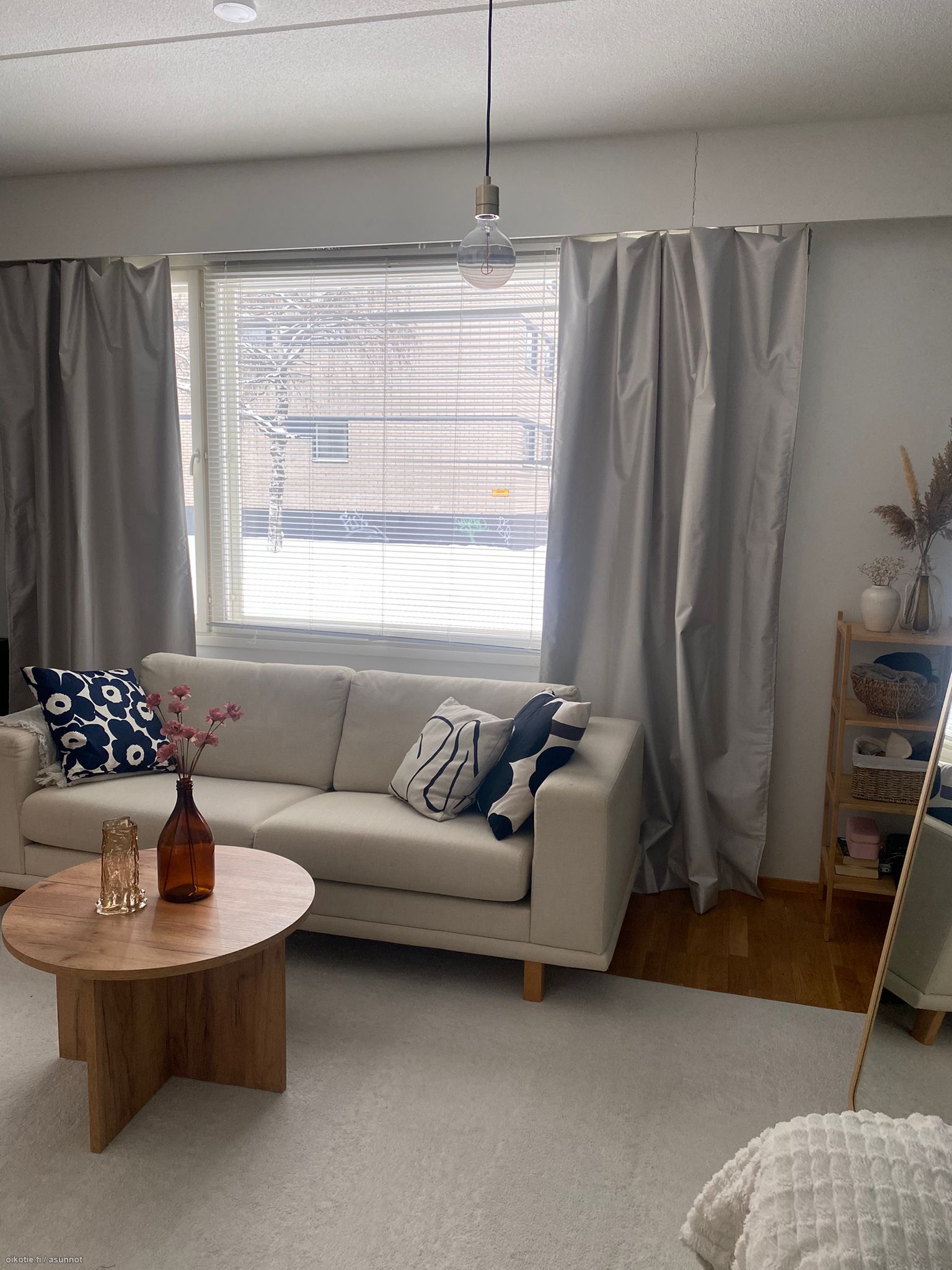 Tämä asunto on hissitalon toisessa kerroksessa. Lattioissa tammilautaparketti, kylpyhuone kaakeloitu, seinät valkoiset maalipinnoin ja yhdellä seinällä tehosteväri. Keittiössä Topi Kalustajan kalusteet. Keittiön varustuksena mm. liesi, jääpakastinkaappi sekä astianpesukone.