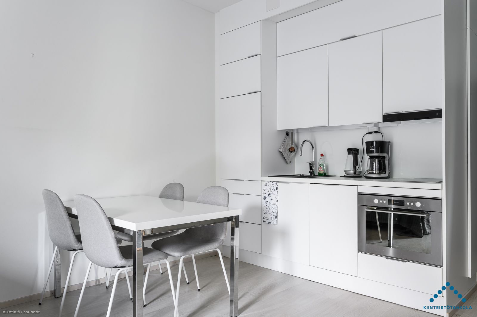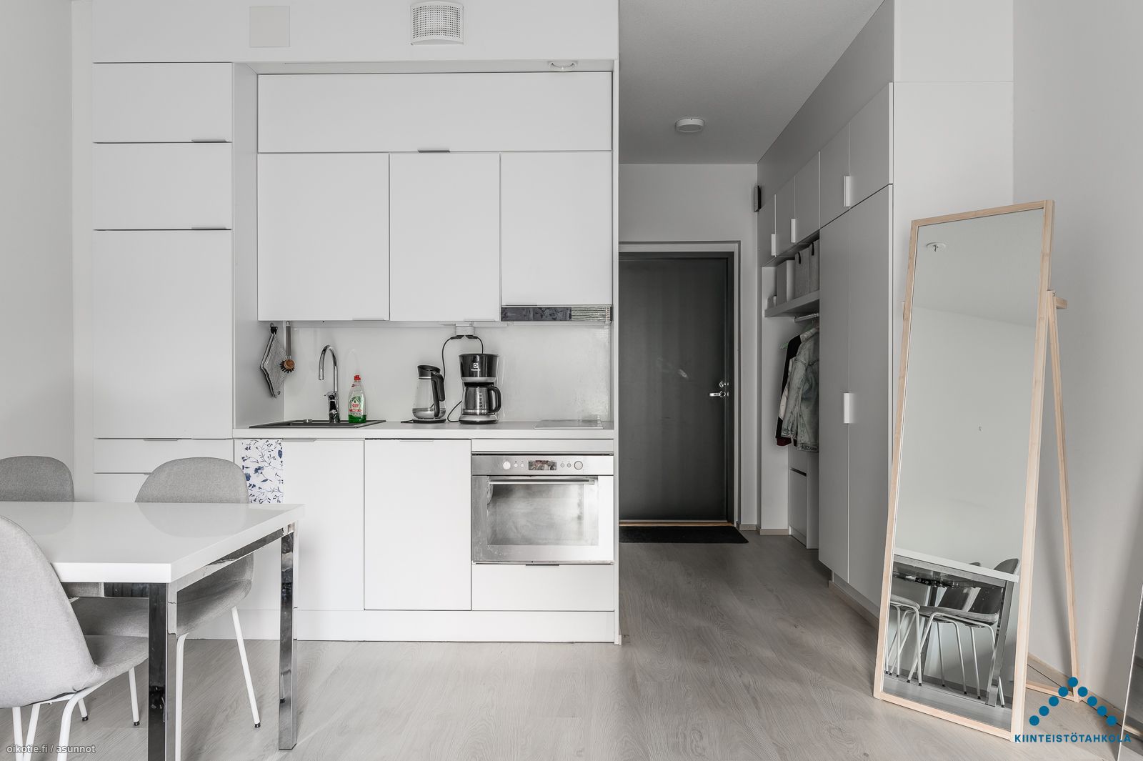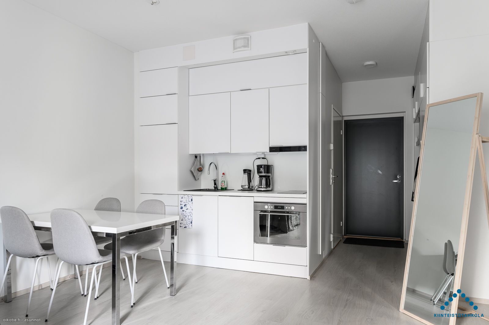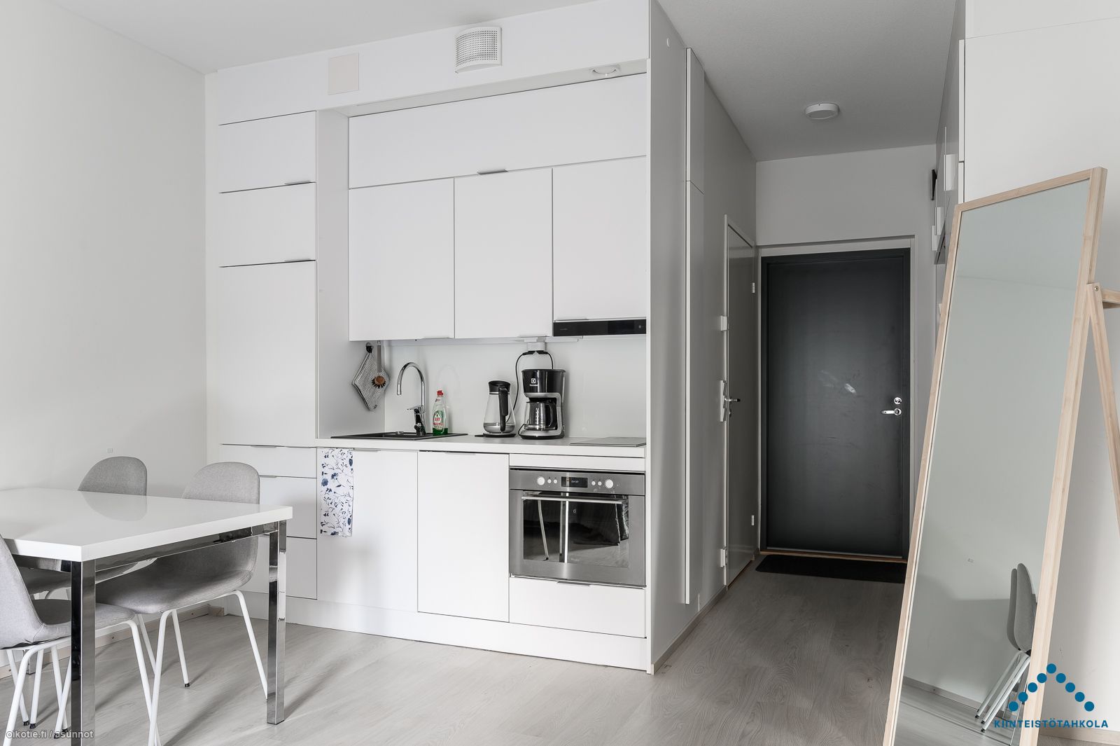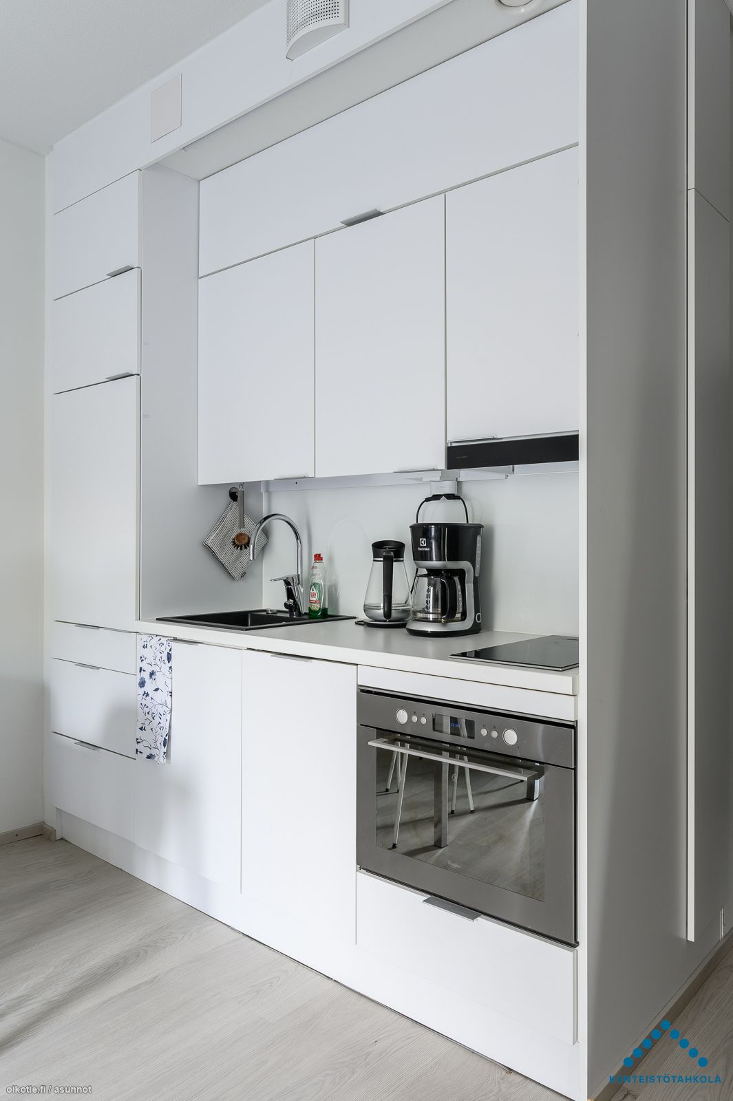 Tämä kolmannen (3/5) kerroksen yksiö saa runsaasti valoa ranskalaiselle parvekkeelle avautuvien lasipariovien kautta. Vaaleasävyisen huoneiston lattiat ovat laminaattia. Keittiössä on yhdistelmäuuni jossa mikroaalto ja kiertoilma toiminto, 2-levyinen keraaminen liesitaso, liesikupu, jääkaappi pakastelokerolla ja astianpesukone. Asunnon kiintokalusteet ja pintamateriaalit ovat tyylikkäitä, kestäviä ja helposti puhdistettavia. Kaakeloidussa kylpyhuoneessa paikka ja liitäntä omalle pyykinpesukoneelle.
