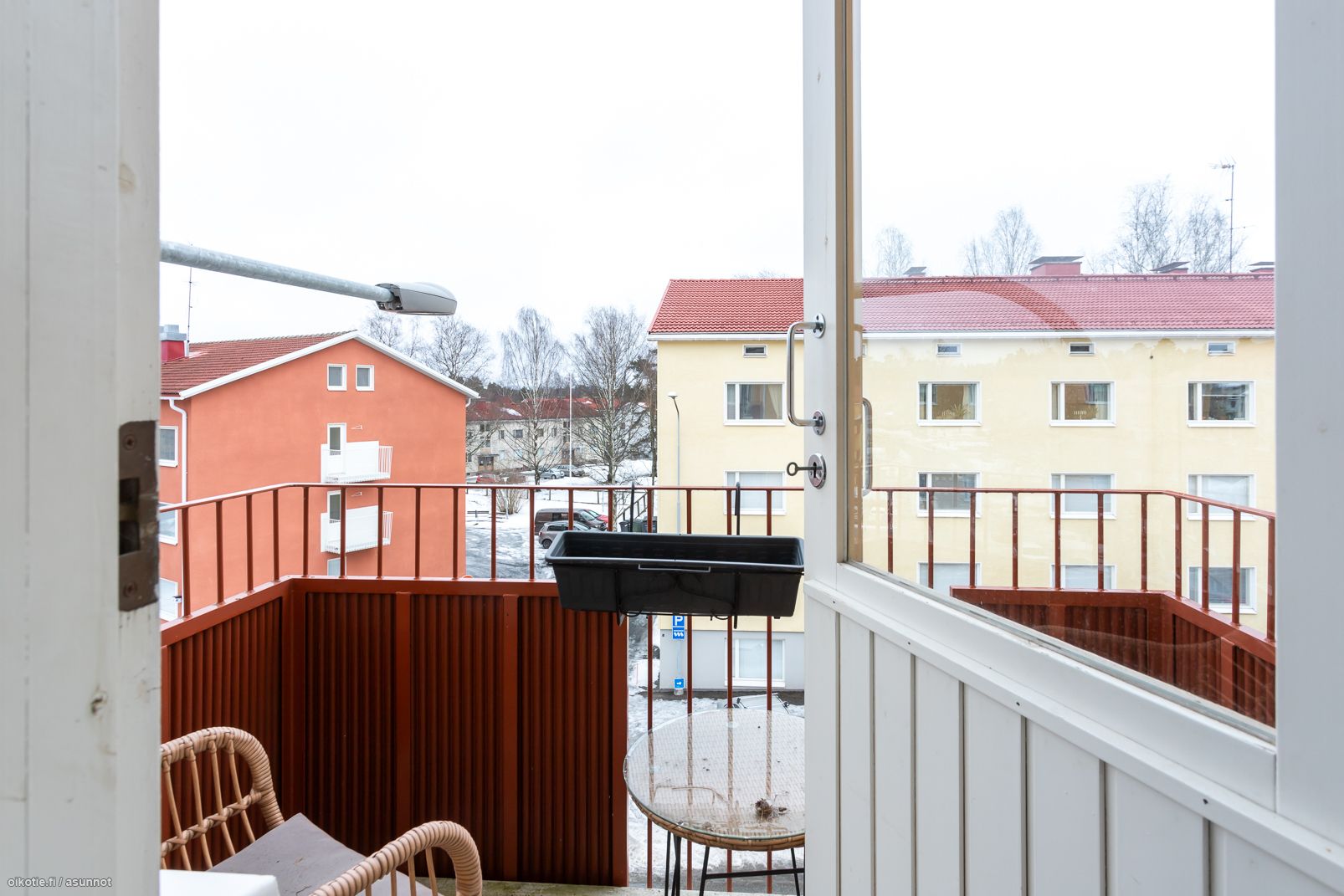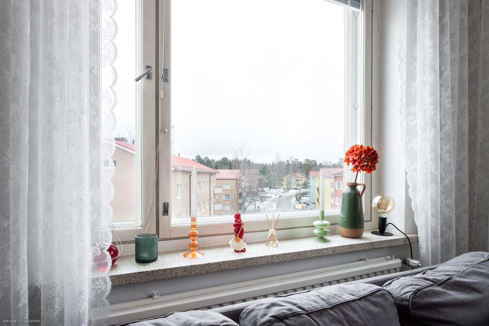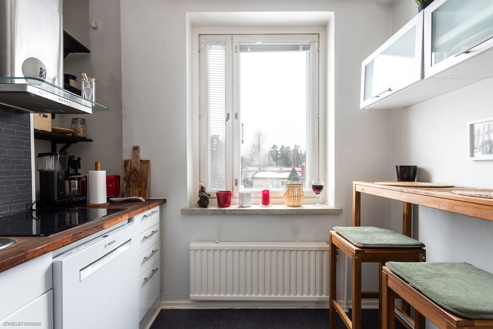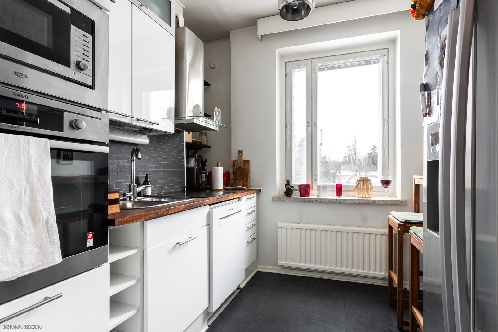 Ylimmän kerroksen huoneisto tarjoaa miellyttävät näkymät ja toimivan pohjaratkaisun. Tyylikkäästi uudistettu keittiö on varustettu nykyaikaisilla kodinkoneilla, ja kylpyhuoneeseen mahtuu pesukone. Olohuoneesta avautuu viihtyisä parveke, joka tuo tilaan valoa ja avaruutta.