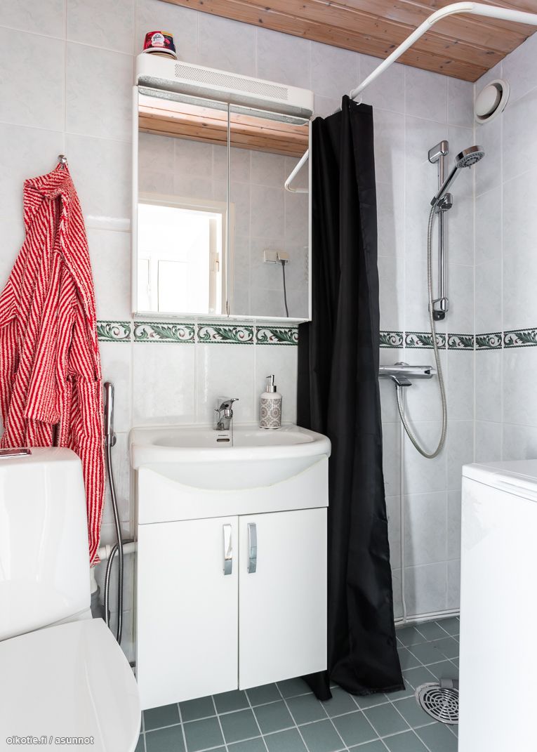 | Kylpyhuoneen varusteet | Varusteet: suihku, peilikaappi, allaskaappi, kiinteät valaisimet, WC. Laatoitettu kylpyhuone, pesukoneliitäntä. Peilikaappi, kylpyhuonekalusteet. |