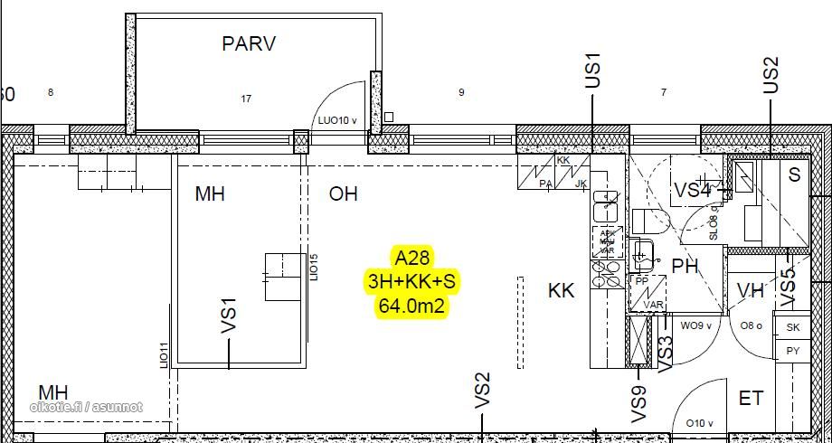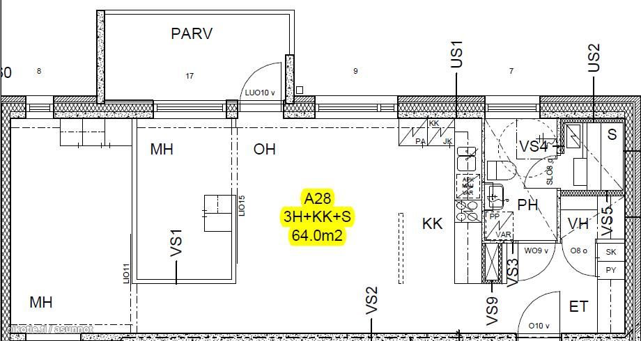 Huoneiston kokoonpano 3h,kk,kh,sa,las.parv