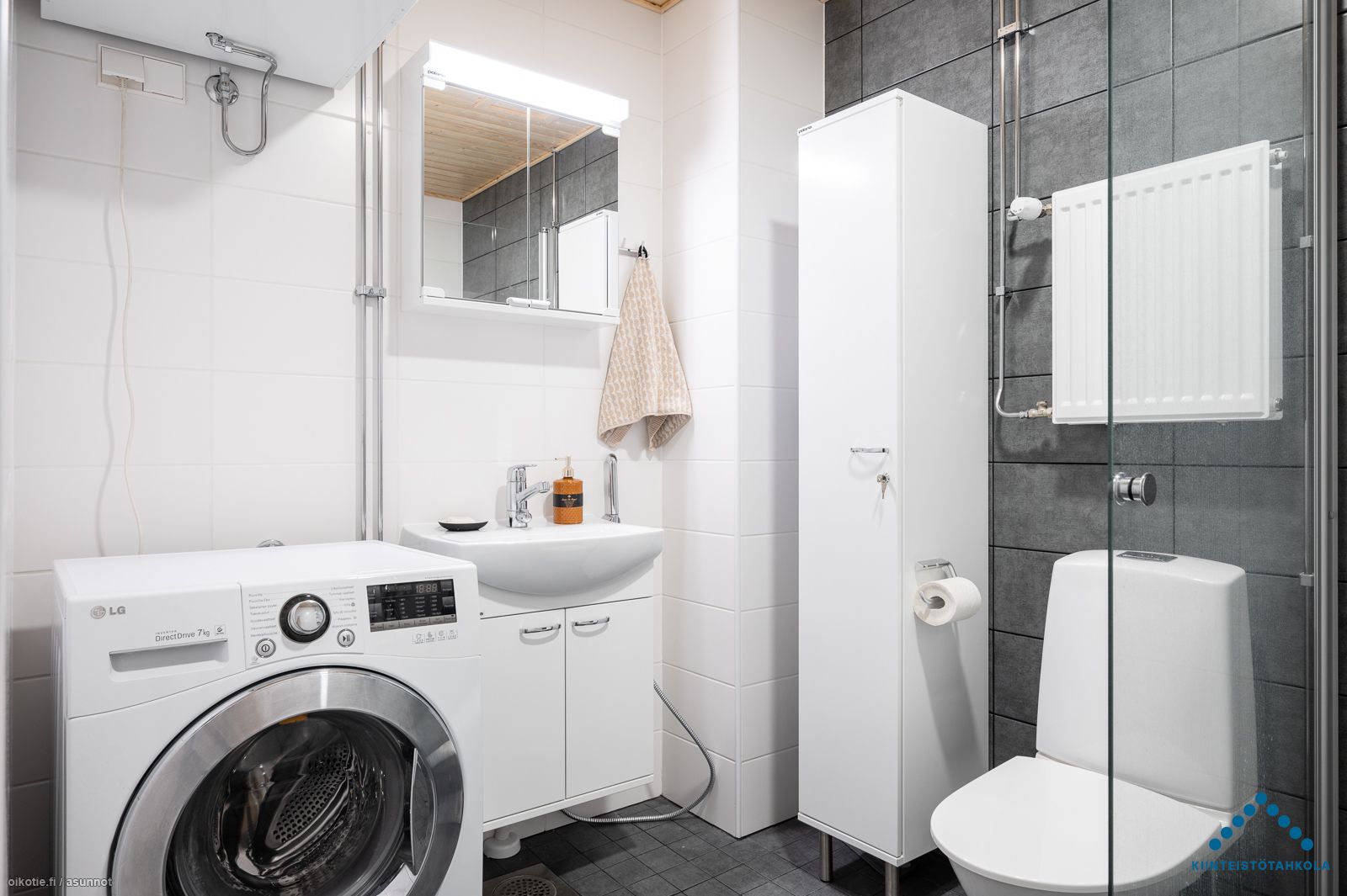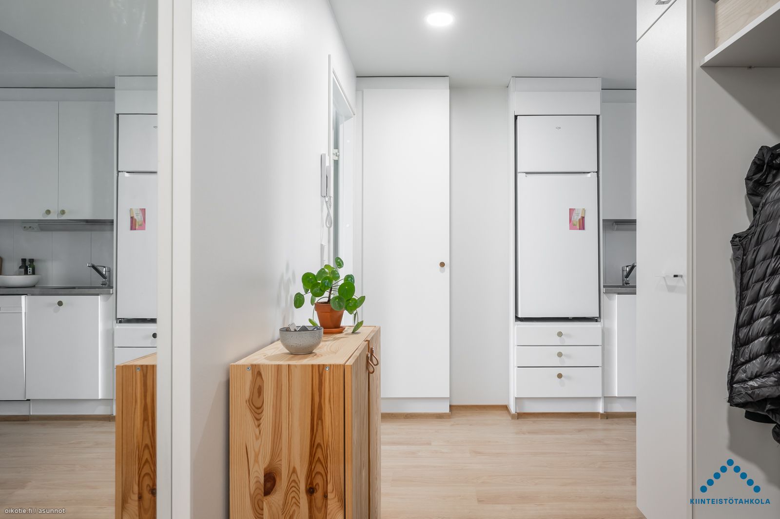 Tämän kuudennen (6/7) kerroksen kivan kaksion sisustusmateriaalit ovat tyylikästä vaaleaa värimaailmaa, valkoiset maalatut seinät ja lattiat puunväristä laminaattia. Keittiötilasta löytyy nykyaikainen koneistus: jääkaappipakastin, keraaminen liesi, erillisuuni ja astianpesukone. Kaakeloidussa kylpyhuoneessa on paikka omalle pyykkikoneelle ja kuvausrummulle. Lasitetulla parvekkeella puolestaan viihdyt pitkälle syksyyn saakka!