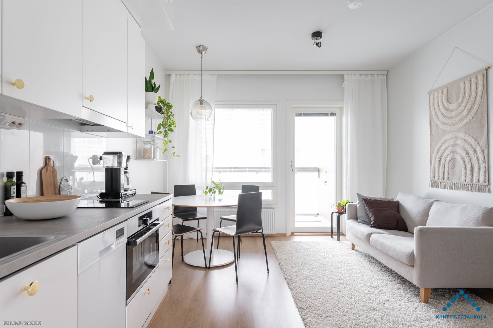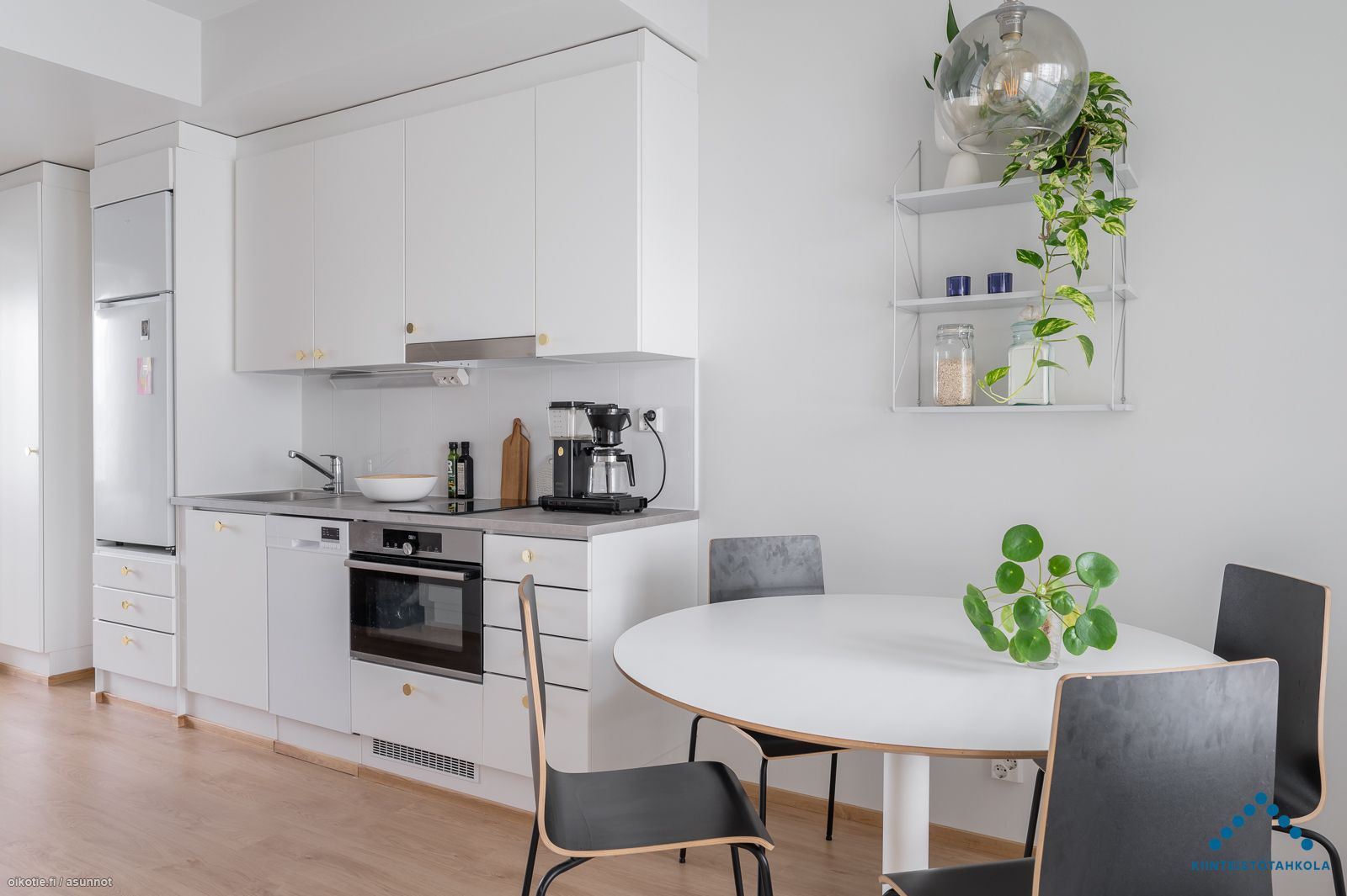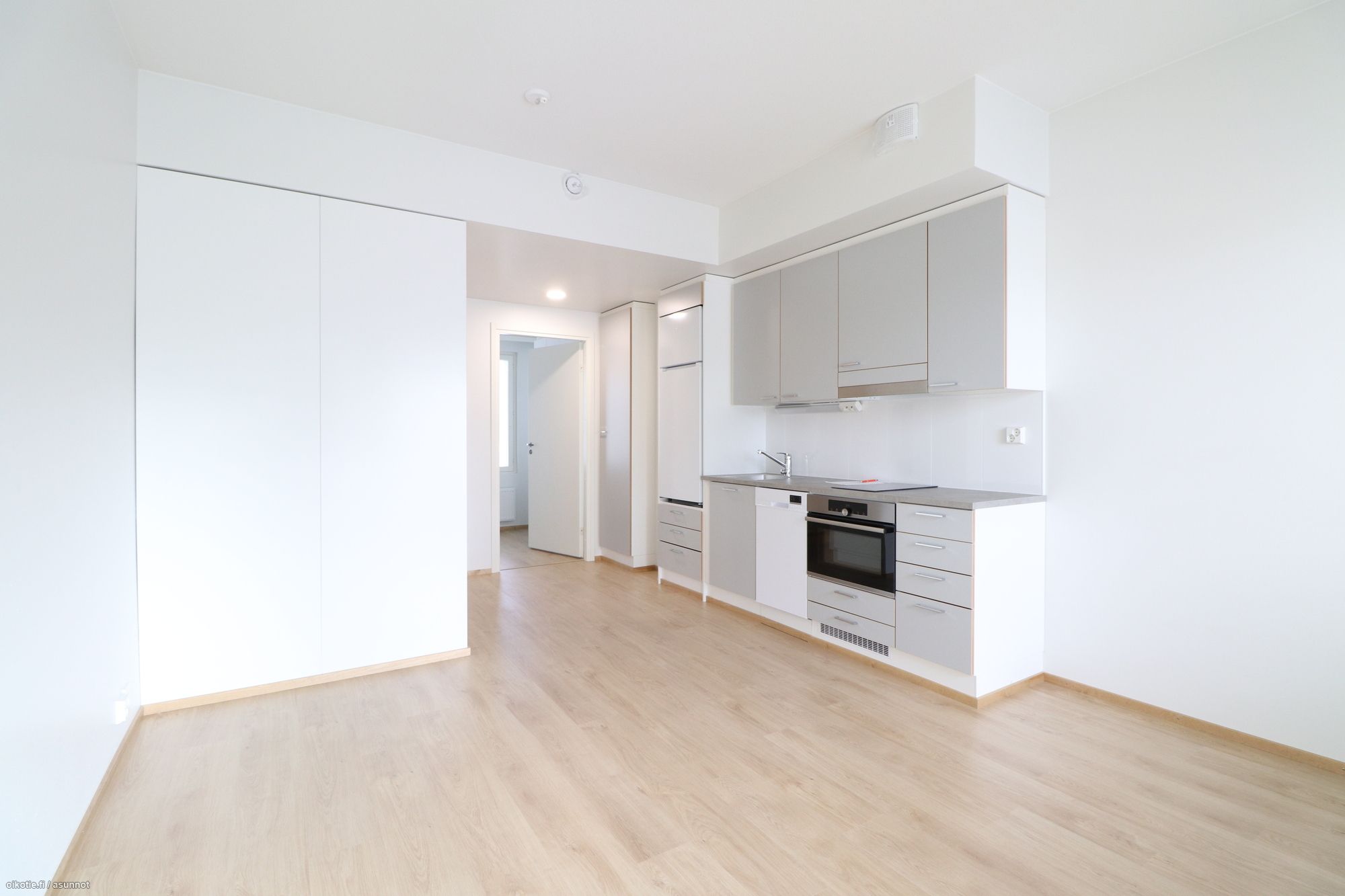 Hox! Kalustetut kuvat vastaavasta asunnosta, tässä asunnossa harmaa keittiö.