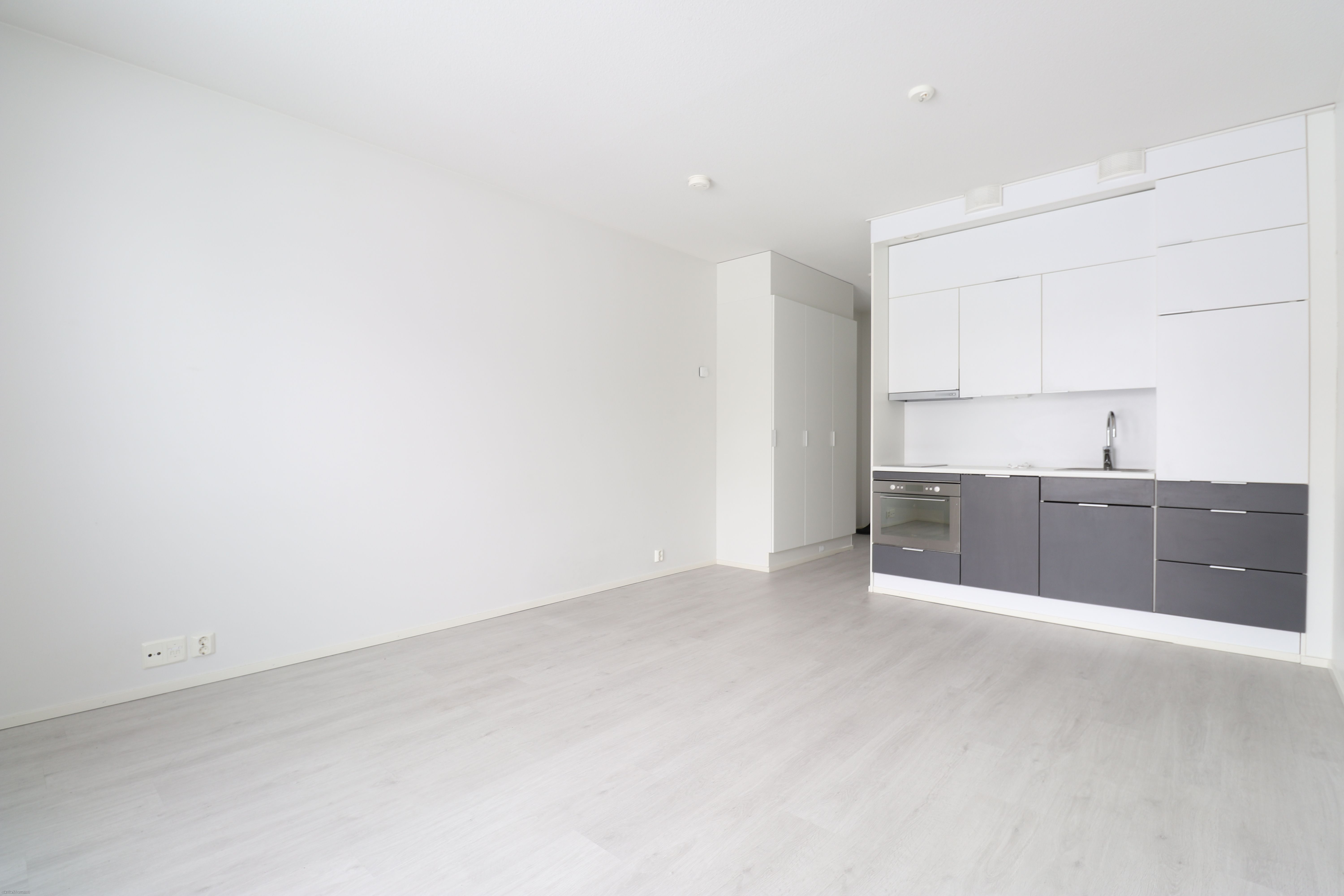 Asunnosta löytyy astianpesukone, hybridiuuni, liesi, jääkaappi sekä kylpyhuoneesta paikka sekä liitännät pyykinpesukoneelle. Kylpyhuoneen seinät on vaalealla laatalla ja asunnon seinät vaalealla maalipinnalla. Taloyhtiön asukkaiden käytössä on taloyhtiön sauna ja vuokraan kuuluu oma häkkivarasto.