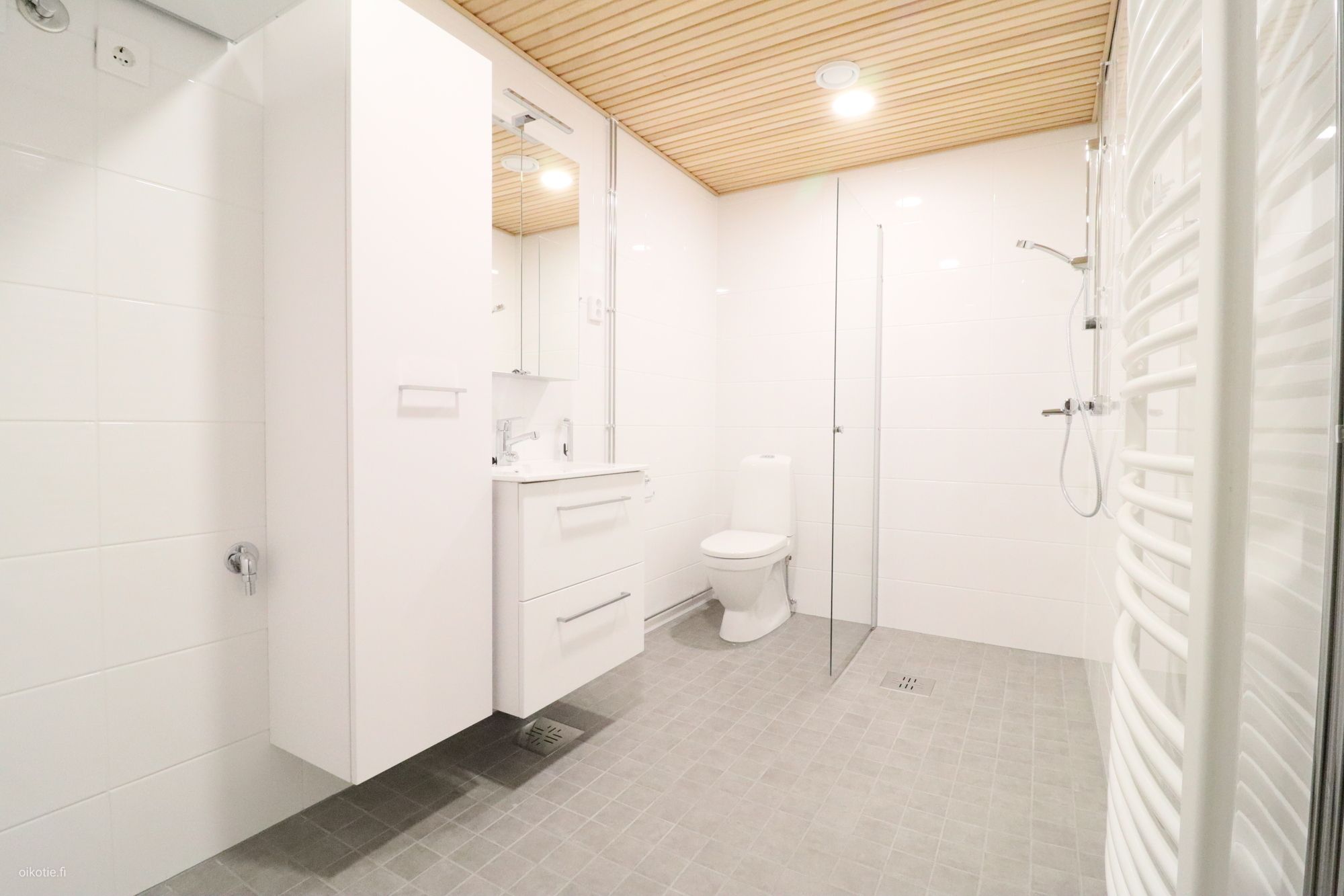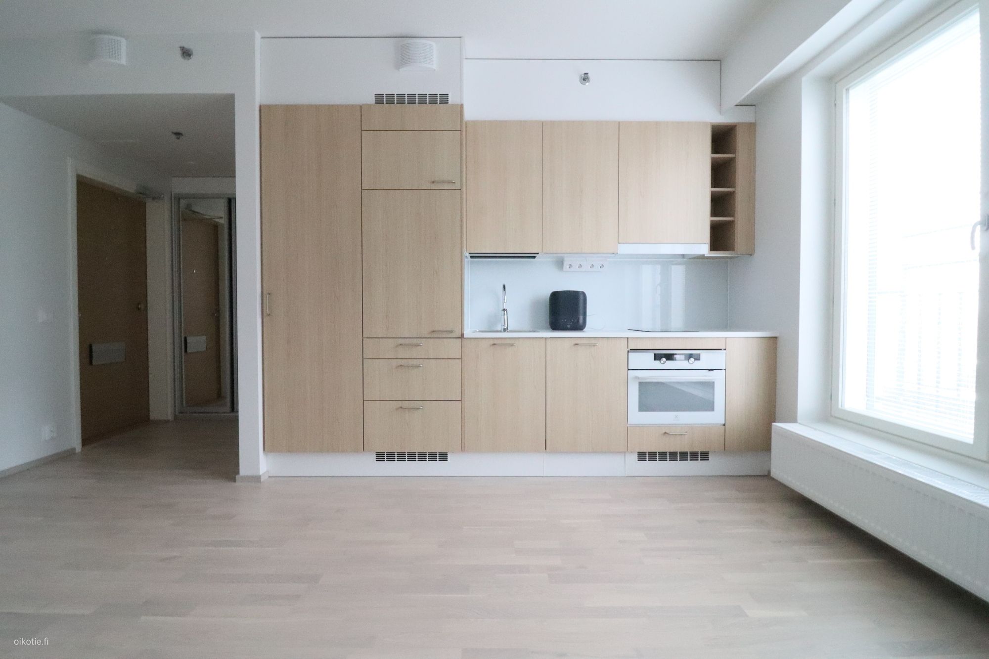 Keittiötila on varustettu kaapistoilla, uunilla, liesitasolla ja säilytystilaa on hyvin. Keittiö on sijoitettu osaksi huonetilaa tehokkaasti. Kylpyhuone on tilava, siellä on kaapistot sekä liitännät pesukoneelle. Peililiukuovellinen kaapisto tarjoaa säilytystilaa eteisen yhteydessä.