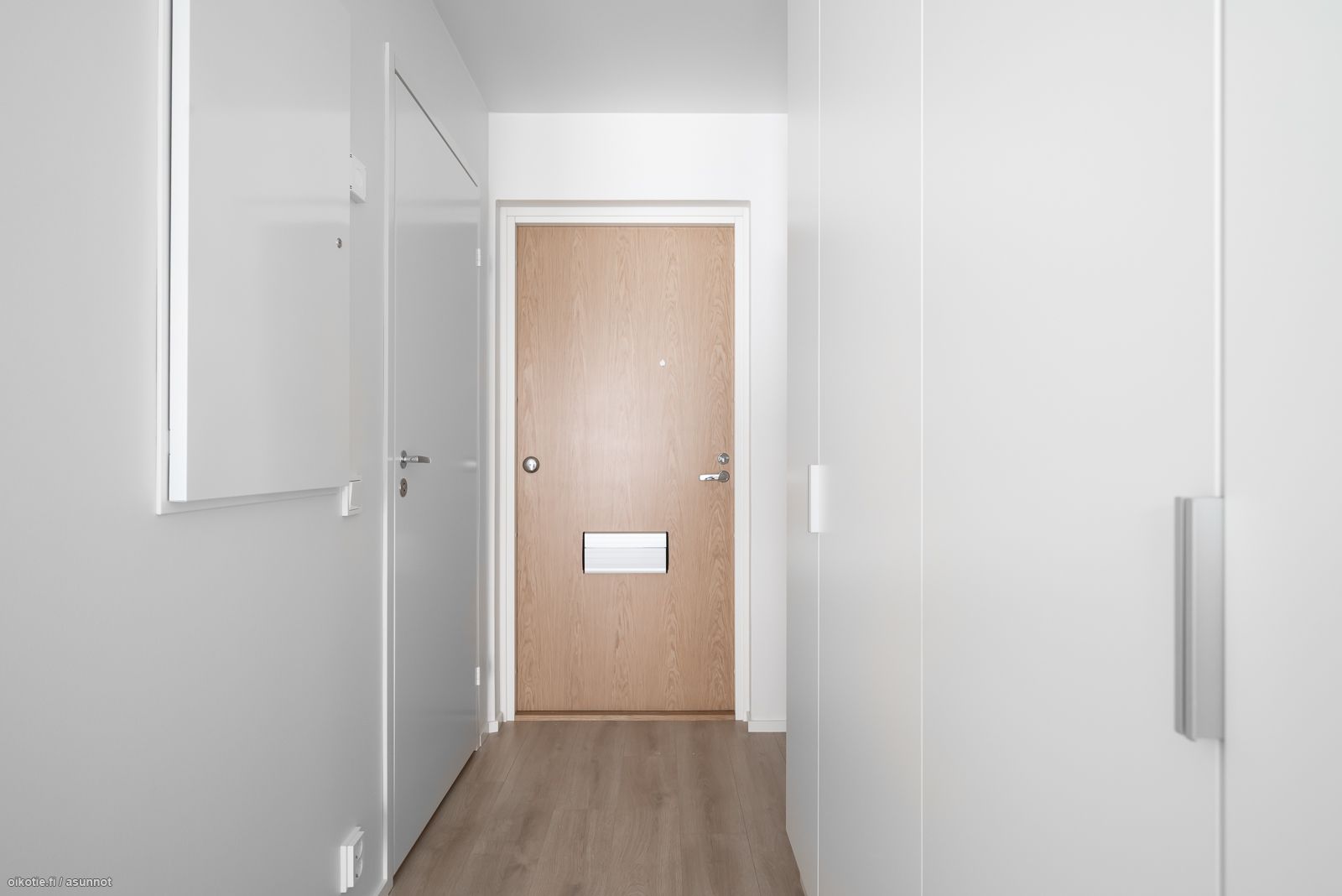 Tässä asunnossa on siistit vaaleat pinnat. Keittiöstä löytyy valmiina kalusteuuni, keraaminen liesitaso, liesituuletin, jääkaappi pakastelokerolla sekä astianpesukone. Vaalean ja harmaan sävyisessä kylpyhuoneessa on liitännät omalle pyykinpesukoneelle. Asunnon lattiat ovat kaunista laminaattia ja seinät puolestaan vaalealla maalipinnalla. Asunnossa on myös ranskalainen parveke, jonka kautta tuulettaminen käy vaivatta. Jokaisessa huoneistossa on myös huoneistokohtainen ilmanvaihto lämmön talteenotolla, mikä pitää huolen raikkaasta sisäilmasta.