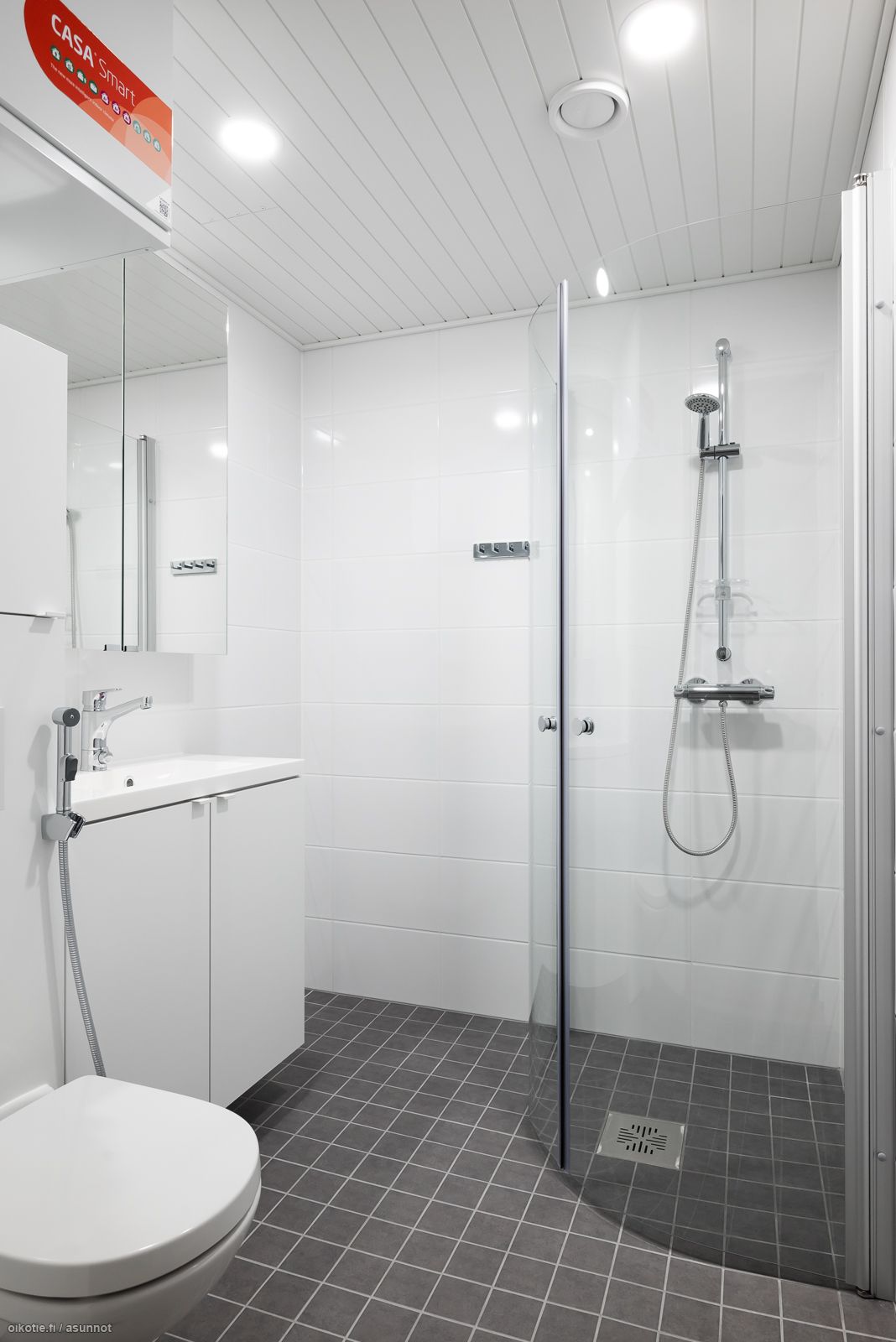 Tässä ensimäisen (1/8) kerroksen asunnossa on hyvä pohjaratkaisu. Keittiössä on kalusteuuni, keraaminen liesitaso, liesituuletin, jääkaappi pakastelokerolla sekä astianpesukone. Vaalean ja harmaan sävyisessä kylpyhuoneessa on liitännät omalle pyykinpesukoneelle. Lattiassa kaunis laminaatti ja seinät vaalein maalipinnoin. Asunnossa on myös ranskalainen parveke.