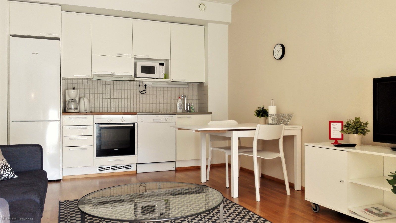 Pesuhuoneessa paikka sekä liitännät pyykinpesukoneelle. Keittiössä valmiina astianpesukone. Ei lemmikkejä.