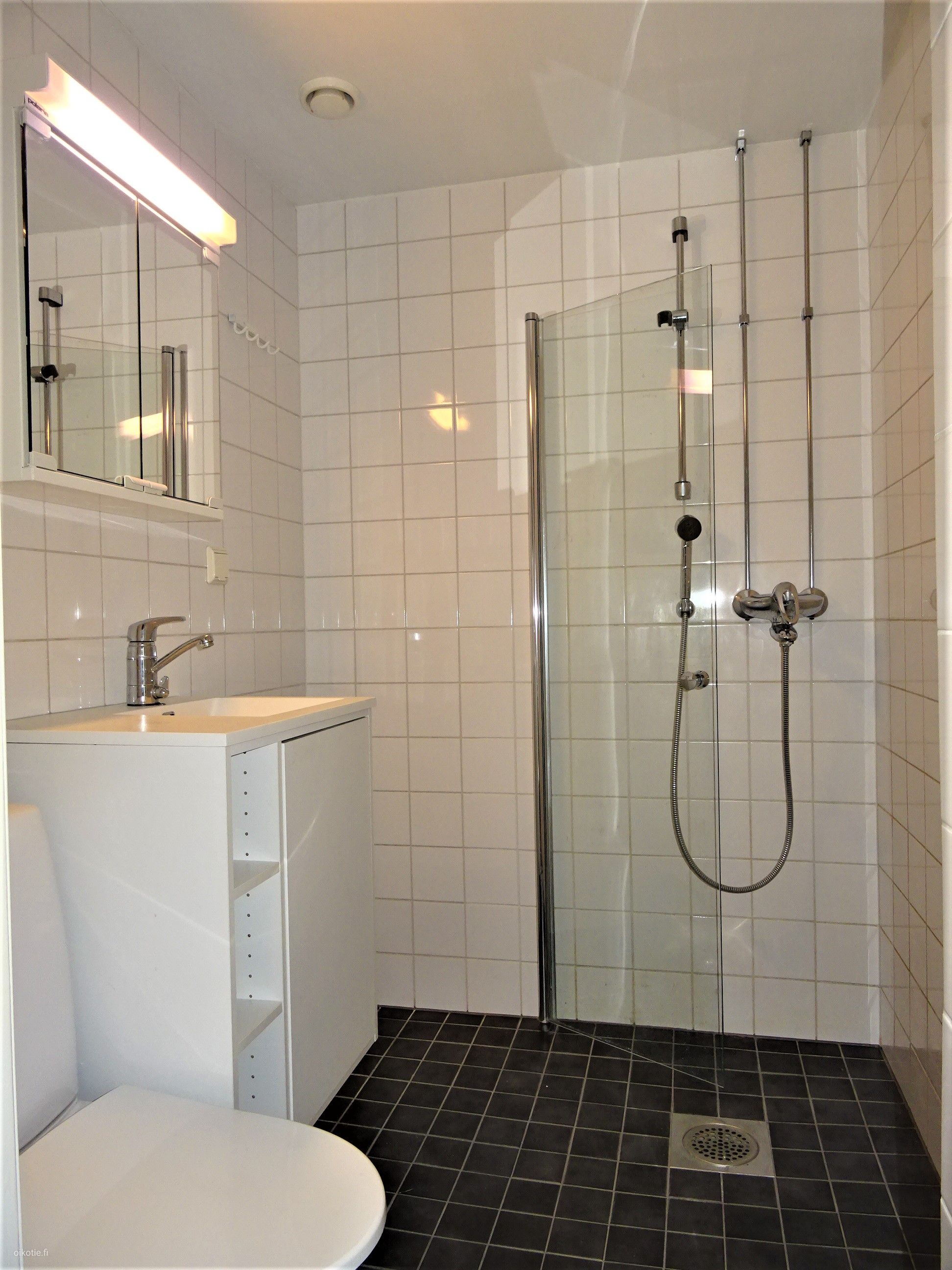 Asunnon kylpyhuone myös remontoitu. Kylpyhuoneessa paikka ja liitännät pyykinpesukoneelle.