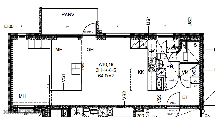 | Huoneiston kokoonpano | 3h,ph/wc,sa,lasparv |