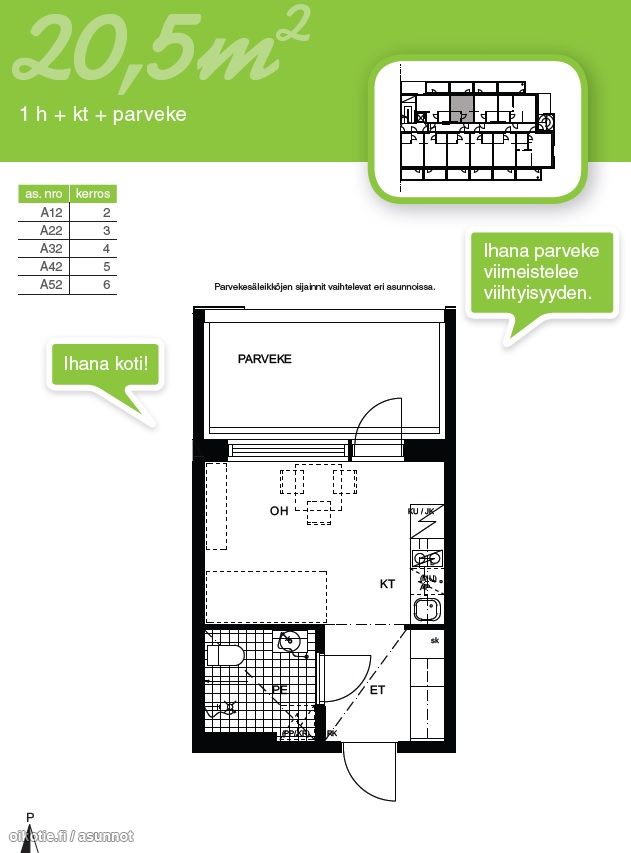 | Huoneiston kokoonpano | 1h,kt,parveke |
