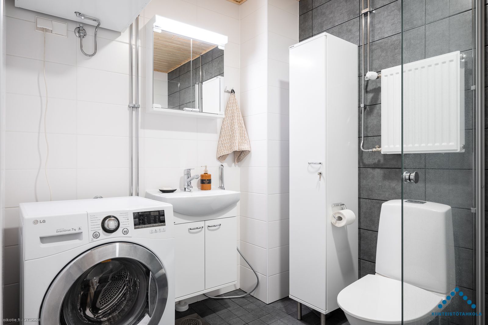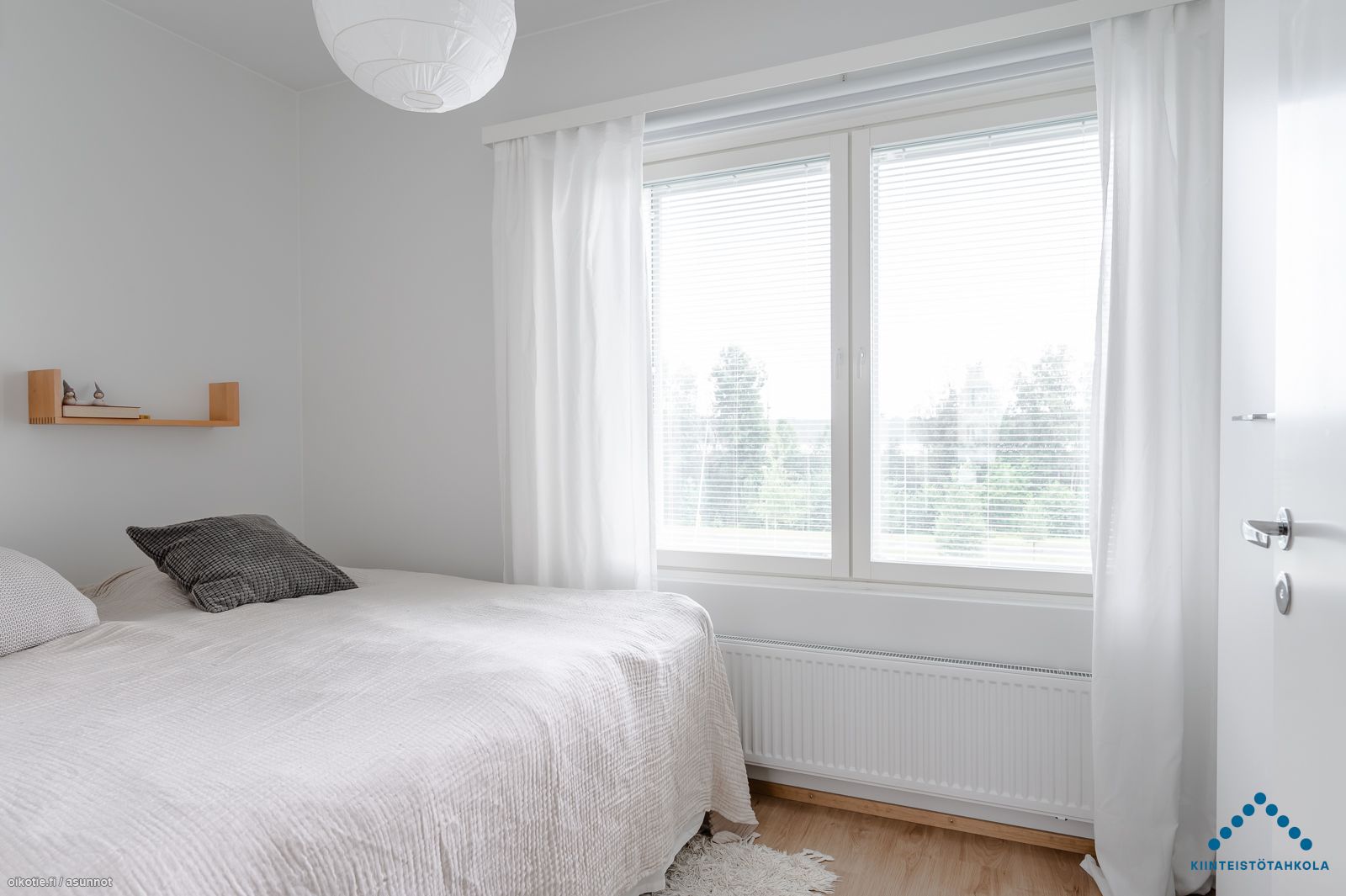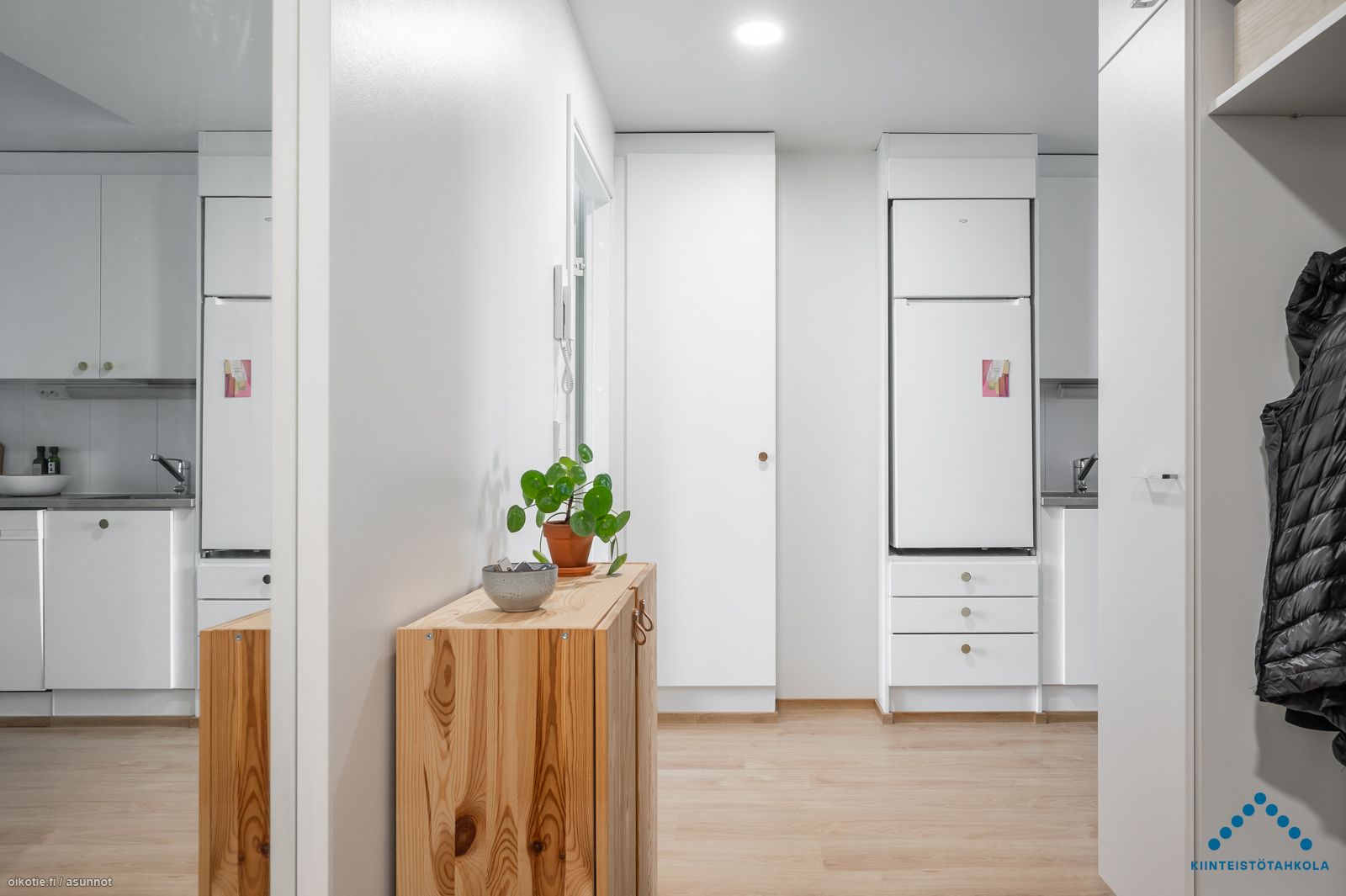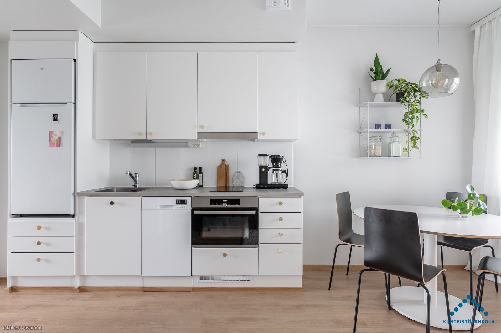 Tämän kuudennen (6/6) kerroksen kaksion sisustusmateriaalit ovat tyylikästä vaaleaa värimaailmaa, valkoiset maalatut seinät ja lattiat puunväristä laminaattia. Keittiötilasta löytyy nykyaikainen koneistus: jääkaappipakastin, keraaminen liesi, erillisuuni ja astianpesukone. Kaakeloidussa kylpyhuoneessa on paikka omalle pyykinpesukoneelle ja kuivausrummulle. Lasitetulla parvekkeella puolestaan viihdyt pitkälle syksyyn saakka!